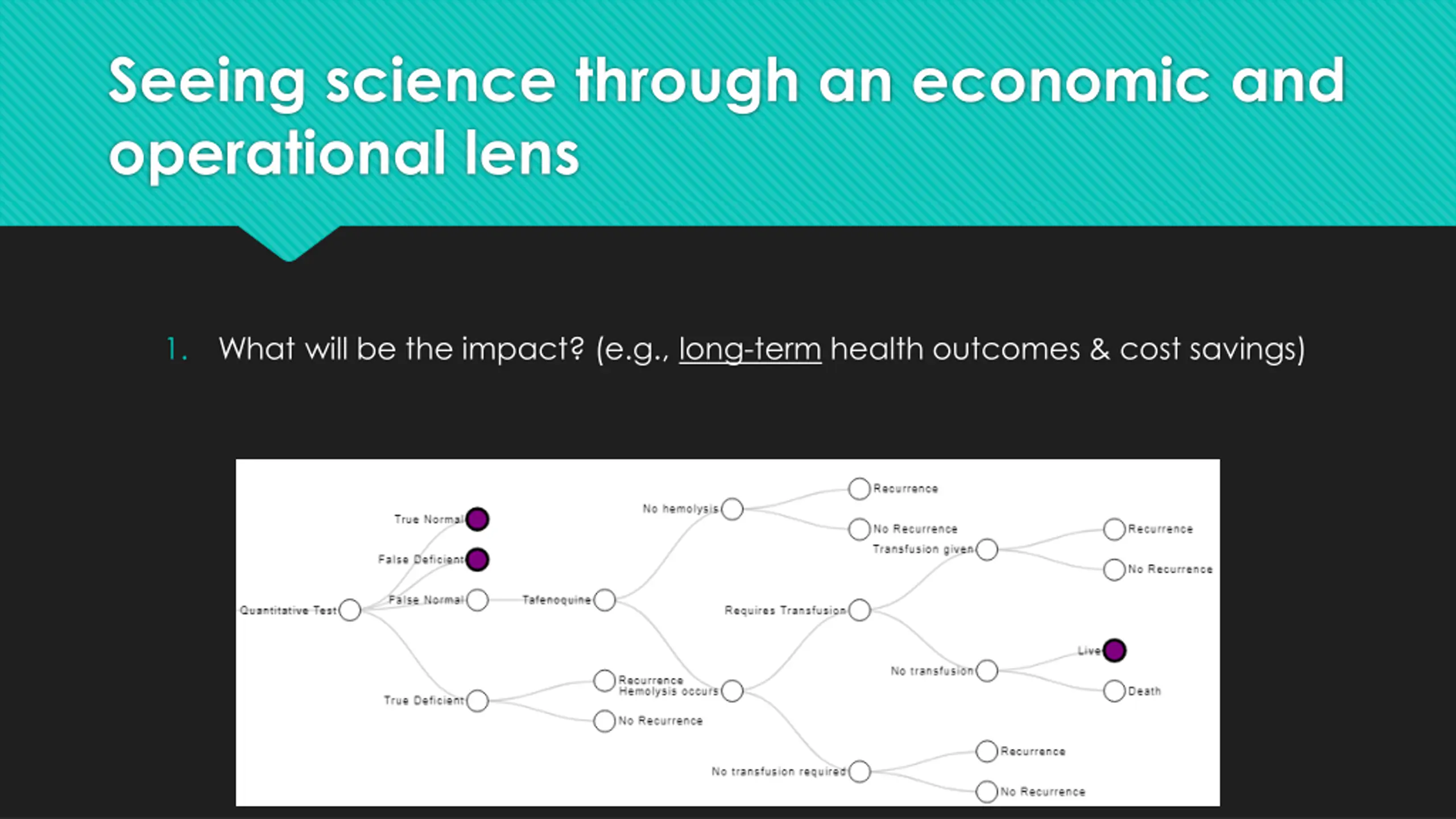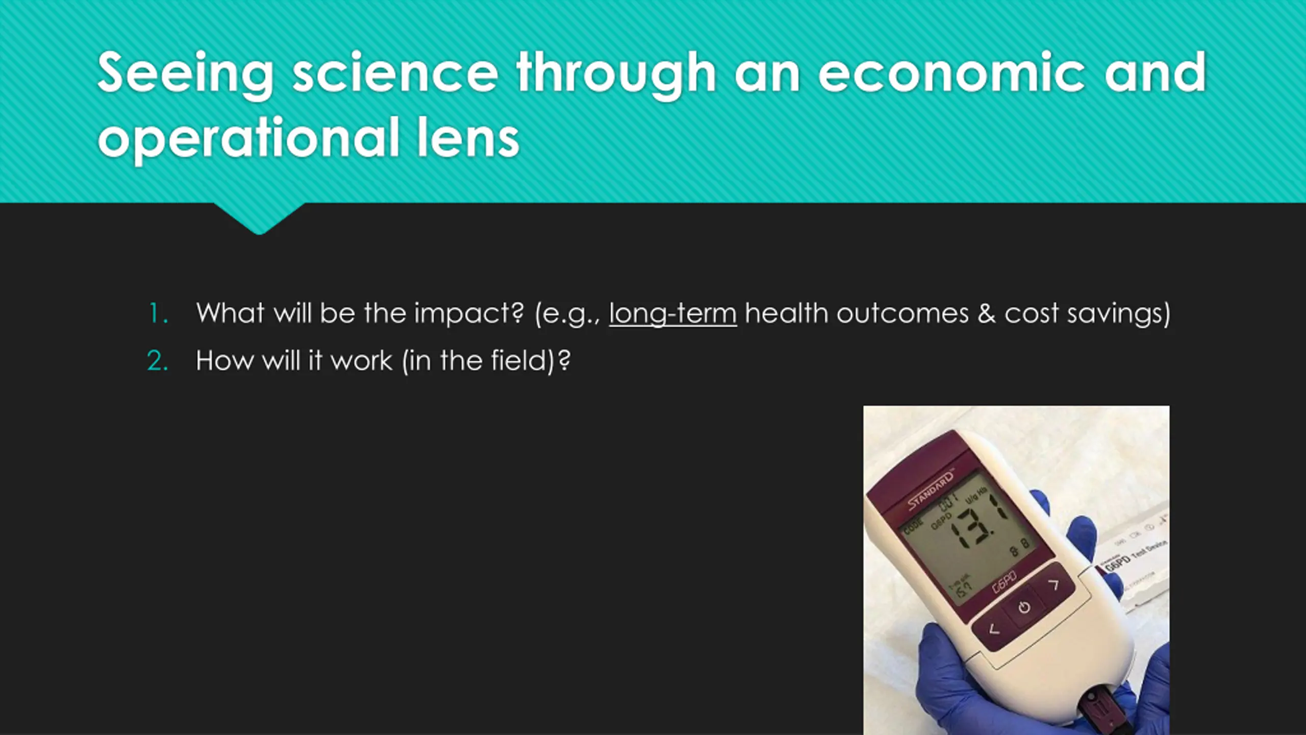 Seeing science through an economic and operational lens 1. What will be the impact? (e.g., long-term health outcomes & cost savings) 2. How will it work (in the field)?