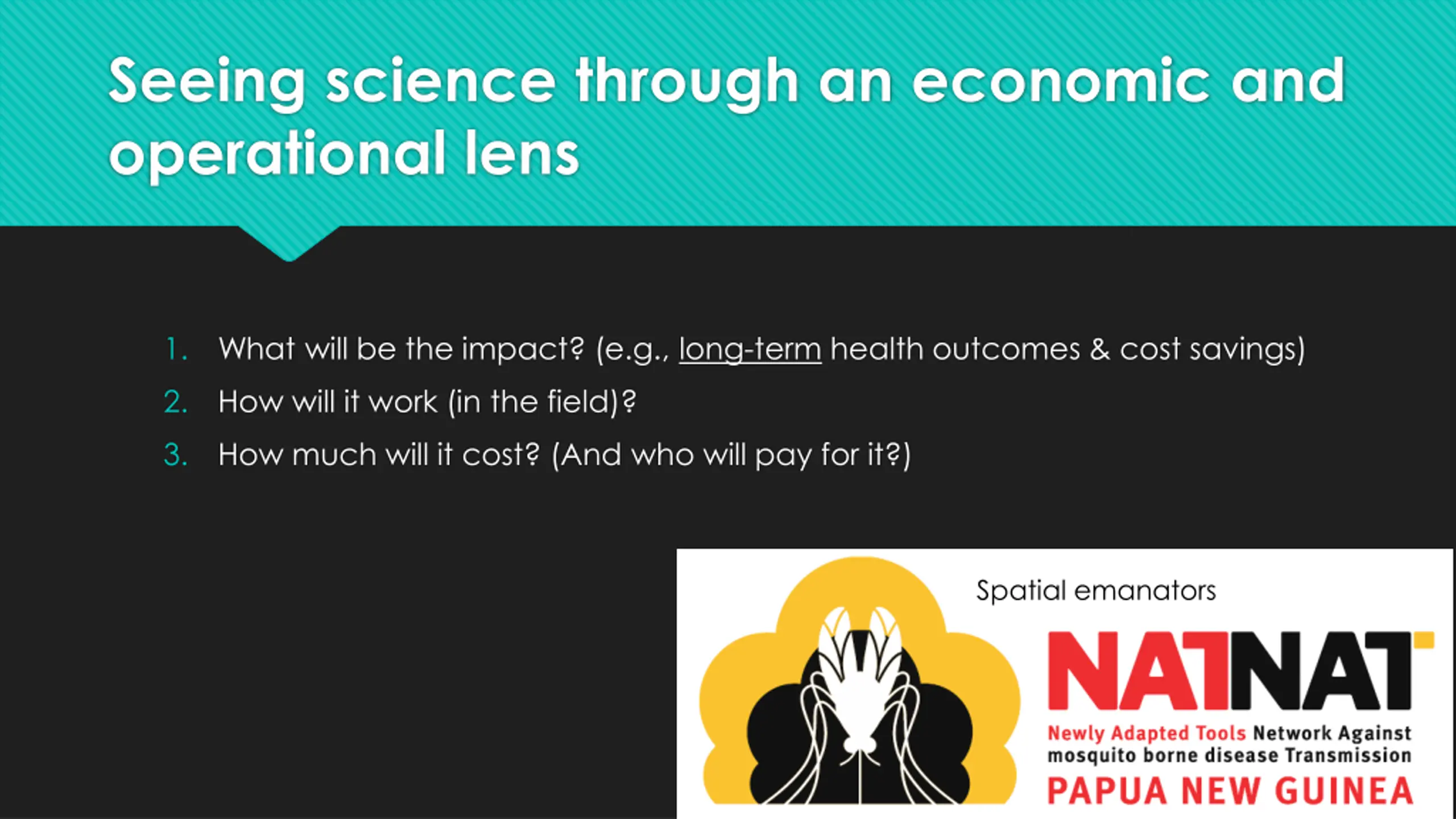 Seeing science through an economic and operational lens 1. What will be the impact? (e.g., long-term health outcomes & cost savings) 2. How will it work (in the field)? 3. How much will it cost? (And who will pay for it?) Spatial emanators