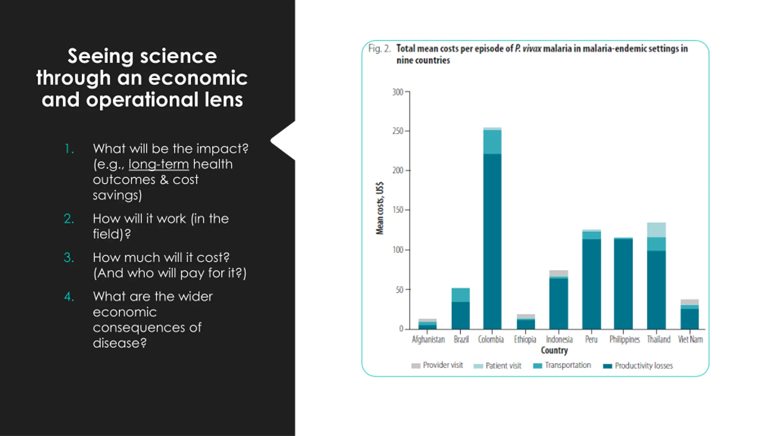 Seeing science through an economic and operational lens 1. What will be the impact? (e.g., long-term health outcomes & cost savings) 2. How will it work (in the field)? 3. How much will it cost? (And who will pay for it?) 4. What are the wider economic consequences of disease?