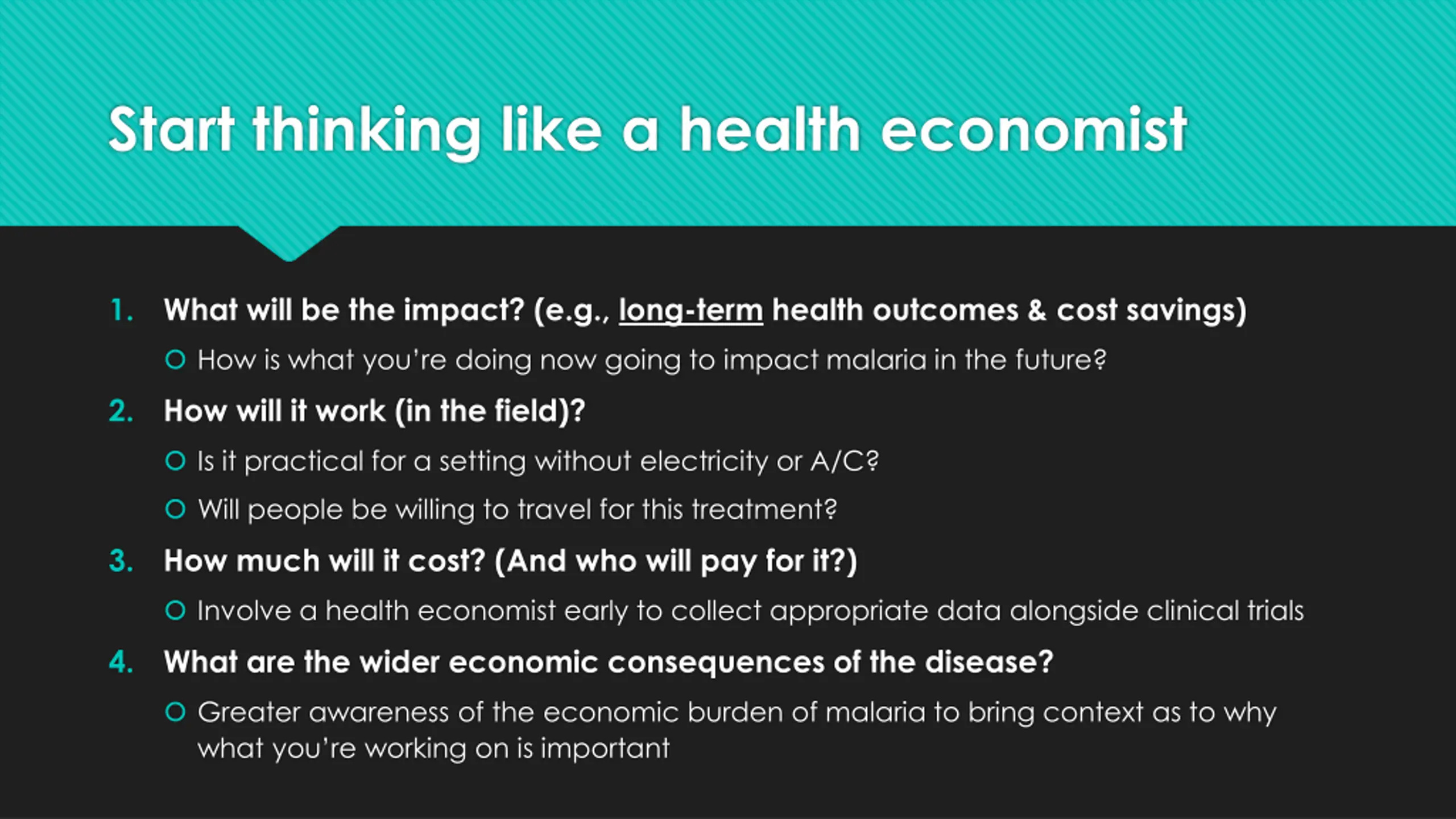 Start thinking like a health economist 1. What will be the impact? (e.g., long-term health outcomes & cost savings) How is what you re doing now going to impact malaria in the future? 2. How will it work (in the field)? Is it practical for a setting without electricity or A/C? Will people be willing to travel for this treatment? 3. How much will it cost? (And who will pay for it?) Involve a health economist early to collect appropriate data alongside clinical trials 4. What are the wider economic consequences of the disease? Greater awareness of the economic burden of malaria to bring context as to why what you re working on is important