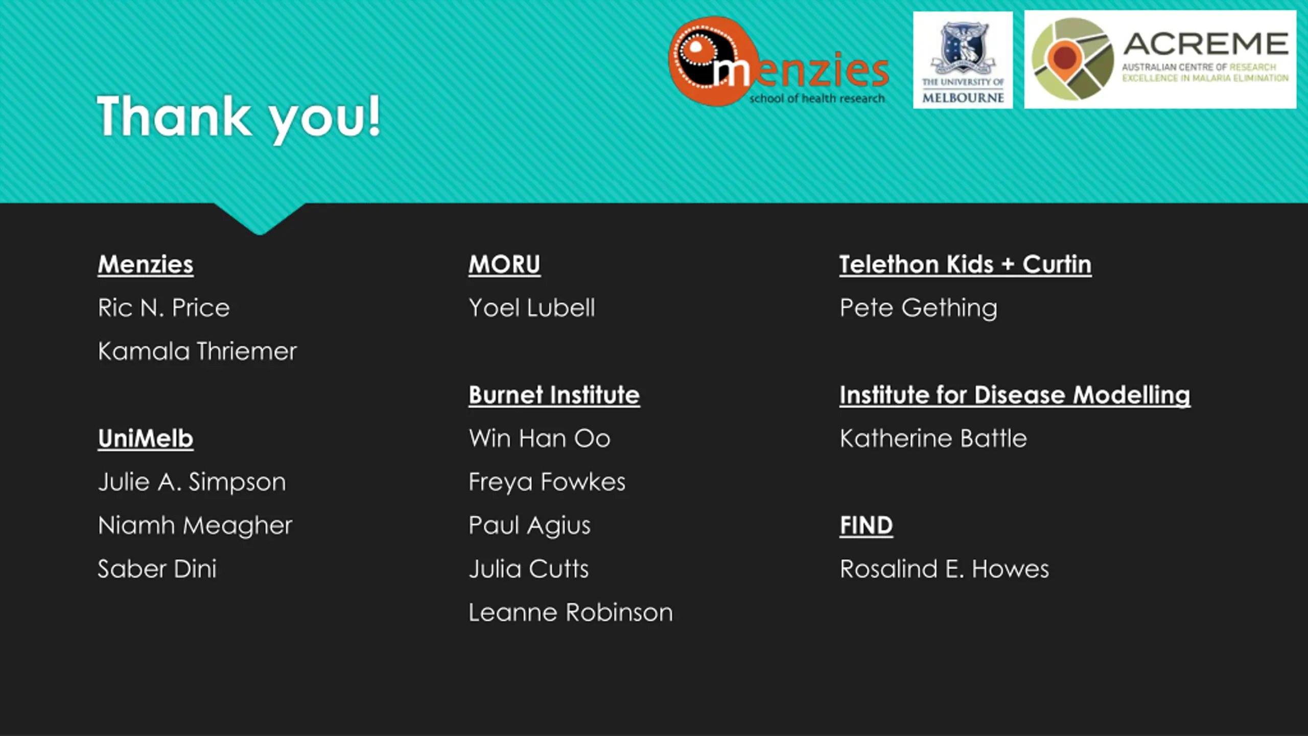 Thank you! Menzies MORU Telethon Kids + Curtin Ric N. Price Yoel Lubell Pete Gething Kamala Thriemer Burnet Institute Institute for Disease Modelling UniMelb Win Han Oo Katherine Battle Julie A. Simpson Freya Fowkes Niamh Meagher Paul Agius FIND Saber Dini Julia Cutts Rosalind E. Howes Leanne Robinson