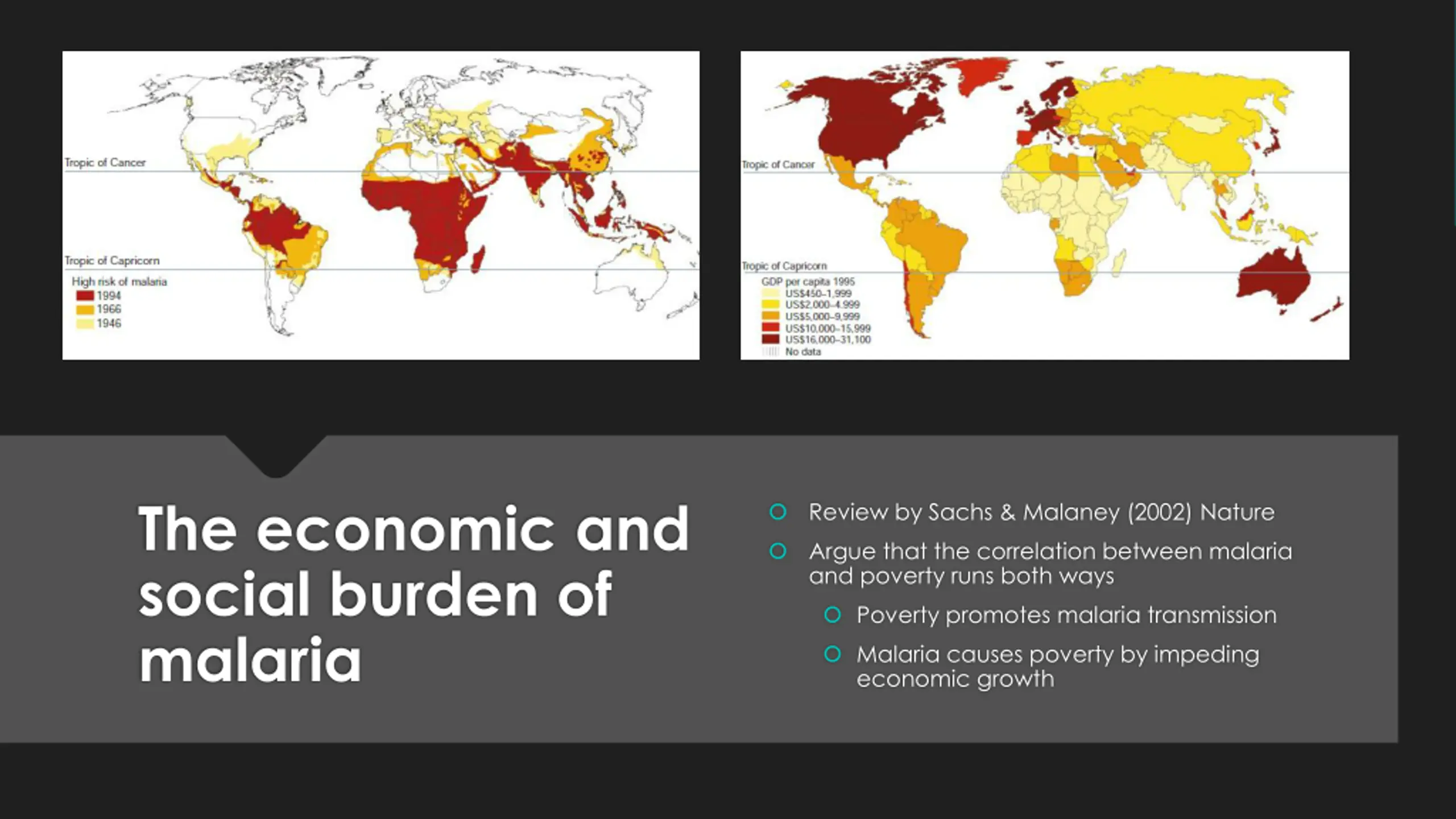 The economic and social burden of malaria Review by Sachs & Malaney (2002) Nature Argue that the correlation between malaria and poverty runs both ways Poverty promotes malaria transmission Malaria causes poverty by impeding economic growth