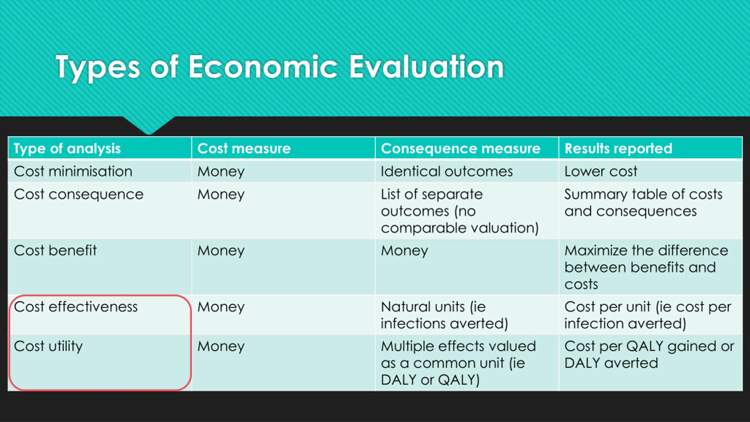 Types of Economic Evaluation Type of analysis Cost minimisation Cost consequence Cost measure Money Money Consequence measure Identical outcomes List of separate outcomes (no comparable valuation) Money Results reported Lower cost Summary table of costs and consequences Cost benefit Money Maximize the difference between benefits and costs Cost per unit (ie cost per infection averted) Cost per QALY gained or DALY averted Cost effectiveness Money Natural units (ie infections averted) Multiple effects valued as a common unit (ie DALY or QALY) Cost utility Money