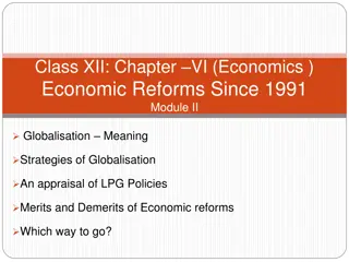 Economic reforms initiated in 1991 under the New Economic Policy focused on liberalisation, privatisation, and globalisation to accelerate economic growth. Liberalisation involved deregulation of the industrial sector, abolishment of industrial licensing, reduction of public sector industries, de-reservation of production areas, and freedom to import capital goods.
