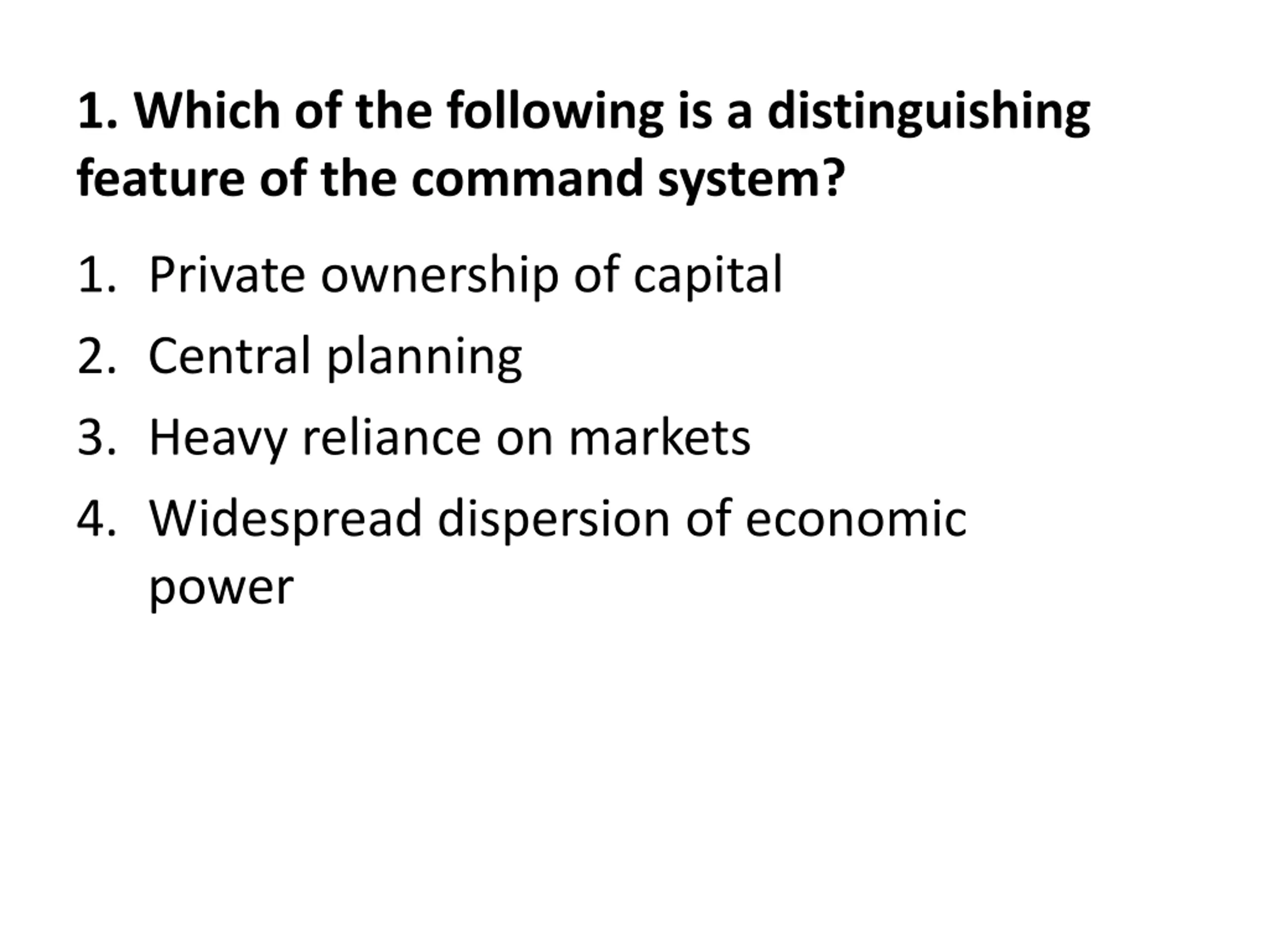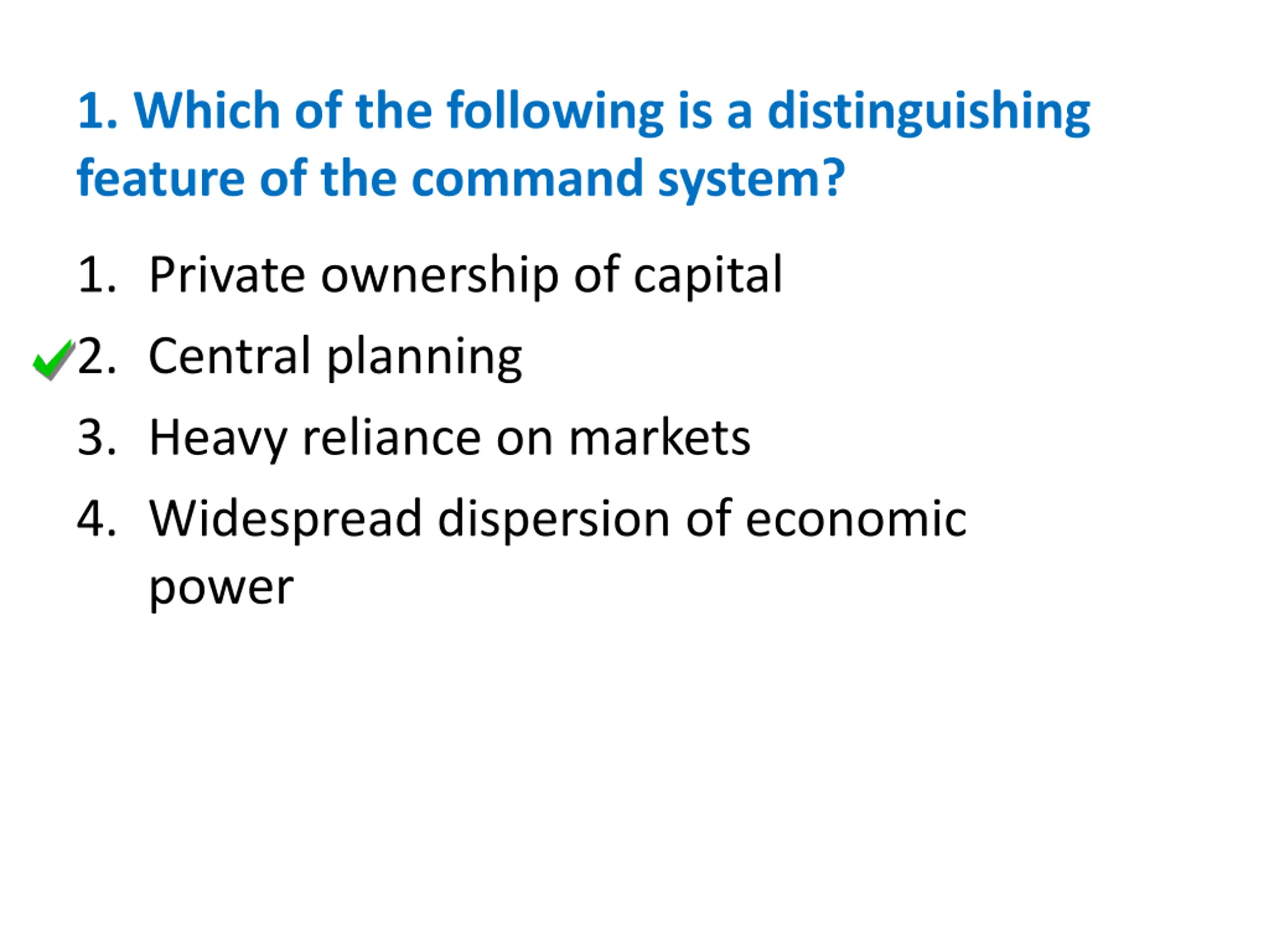 1. Which of the following is a distinguishing feature of the command system? 1. Private ownership of capital 2. Central planning 3. Heavy reliance on markets 4. Widespread dispersion of economic power