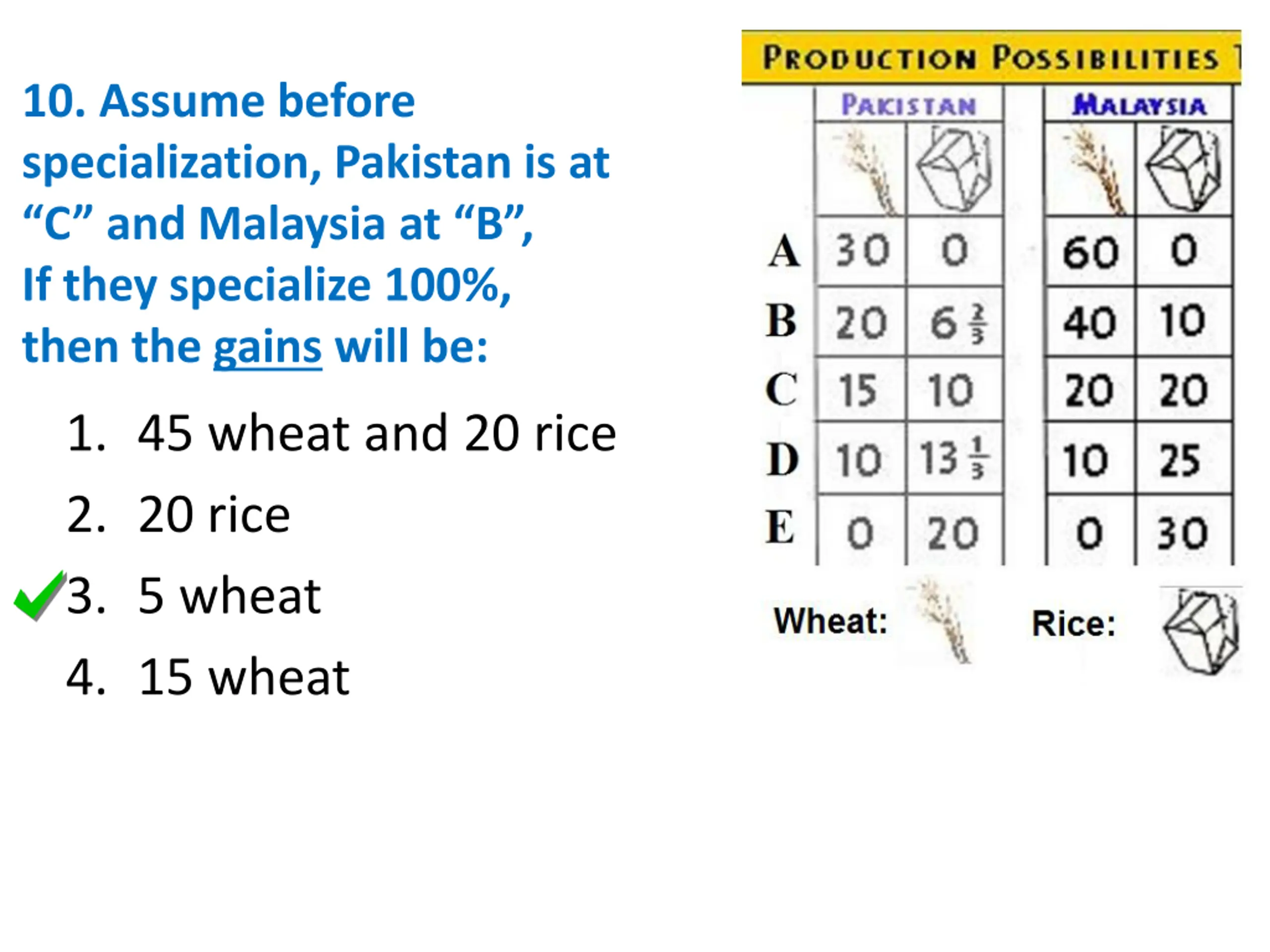 10. Assume before specialization, Pakistan is at C and Malaysia at B , If they specialize 100%, then the gains will be: 1. 45 wheat and 20 rice 2. 20 rice 3. 5 wheat 4. 15 wheat