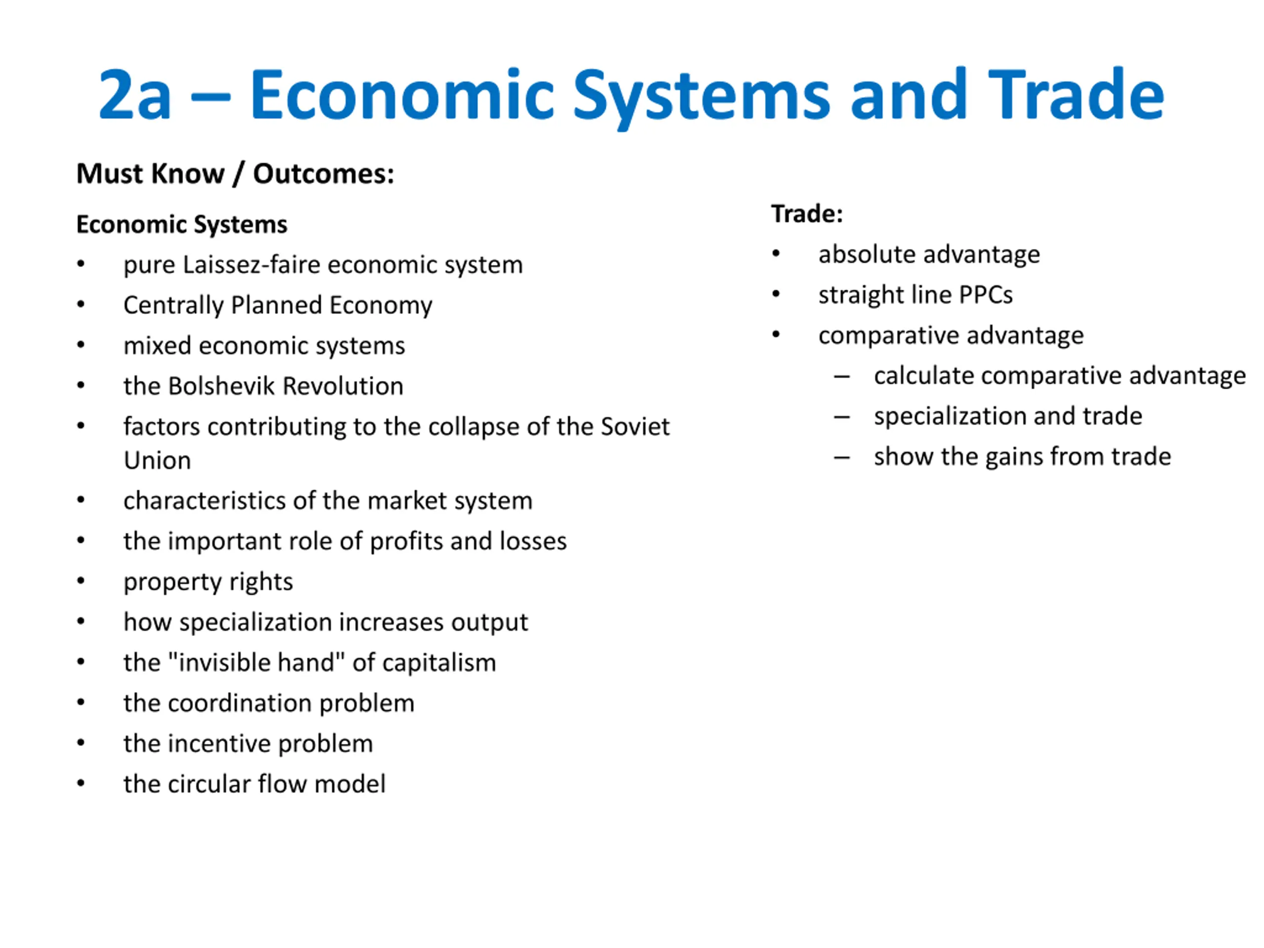 2a Economic Systems and Trade Must Know / Outcomes: Trade: Economic Systems pure Laissez-faire economic system Centrally Planned Economy mixed economic systems the Bolshevik Revolution factors contributing to the collapse of the Soviet Union characteristics of the market system the important role of profits and losses property rights how specialization increases output the "invisible hand" of capitalism the coordination problem the incentive problem the circular flow model absolute advantage straight line PPCs comparative advantage calculate comparative advantage specialization and trade show the gains from trade