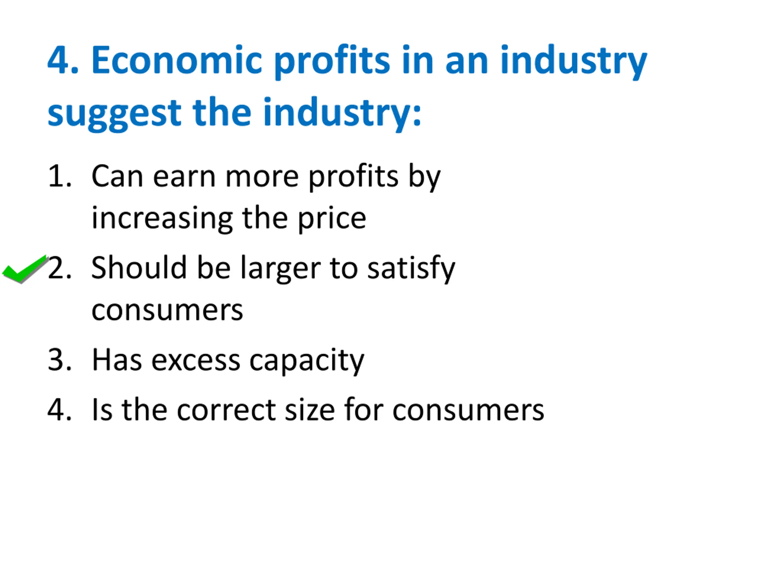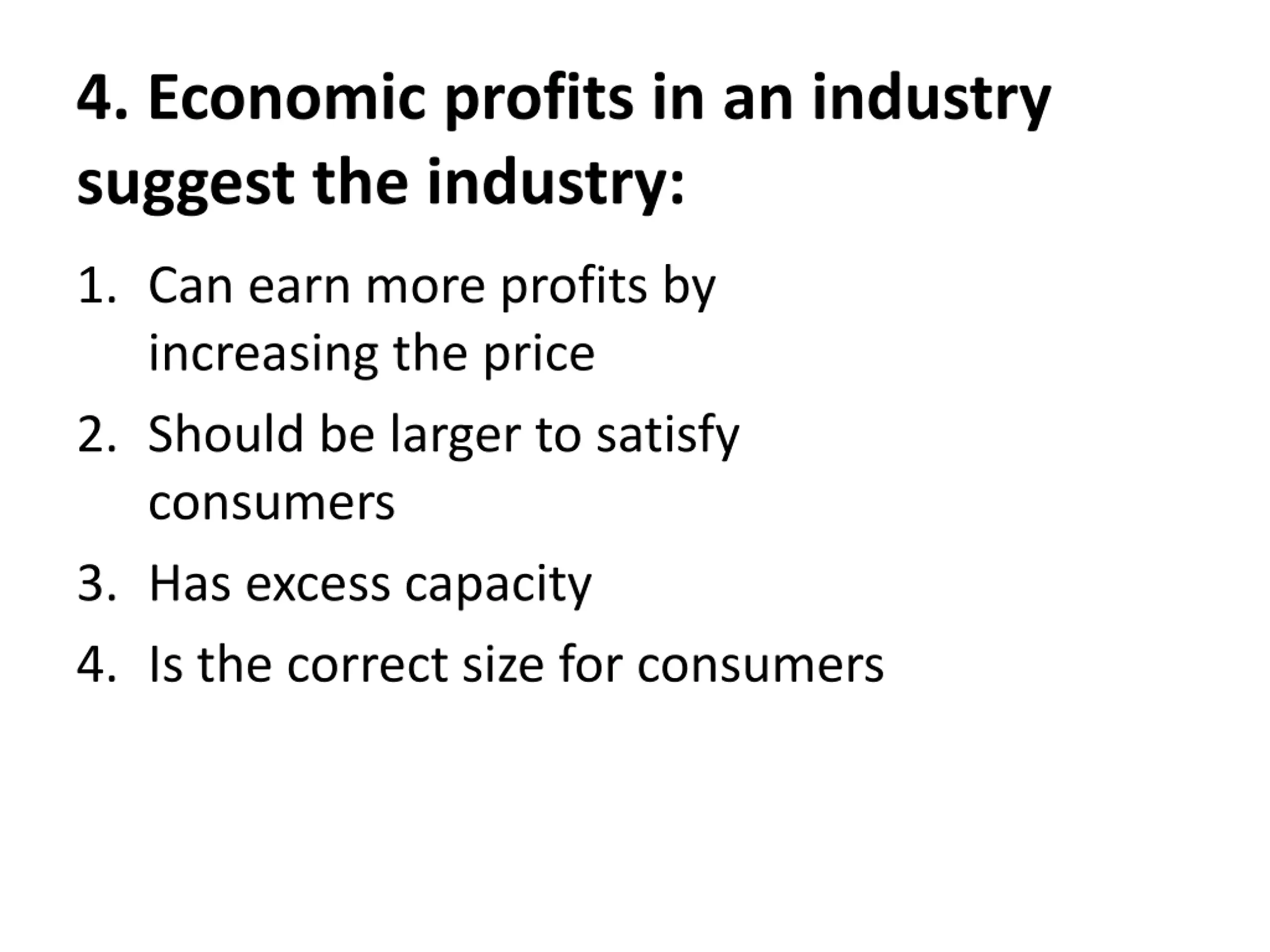4. Economic profits in an industry suggest the industry: 1. Can earn more profits by increasing the price 2. Should be larger to satisfy consumers 3. Has excess capacity 4. Is the correct size for consumers