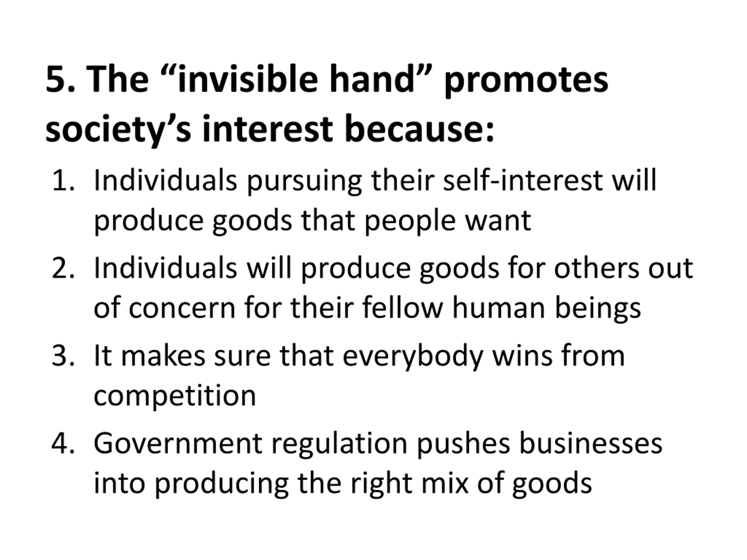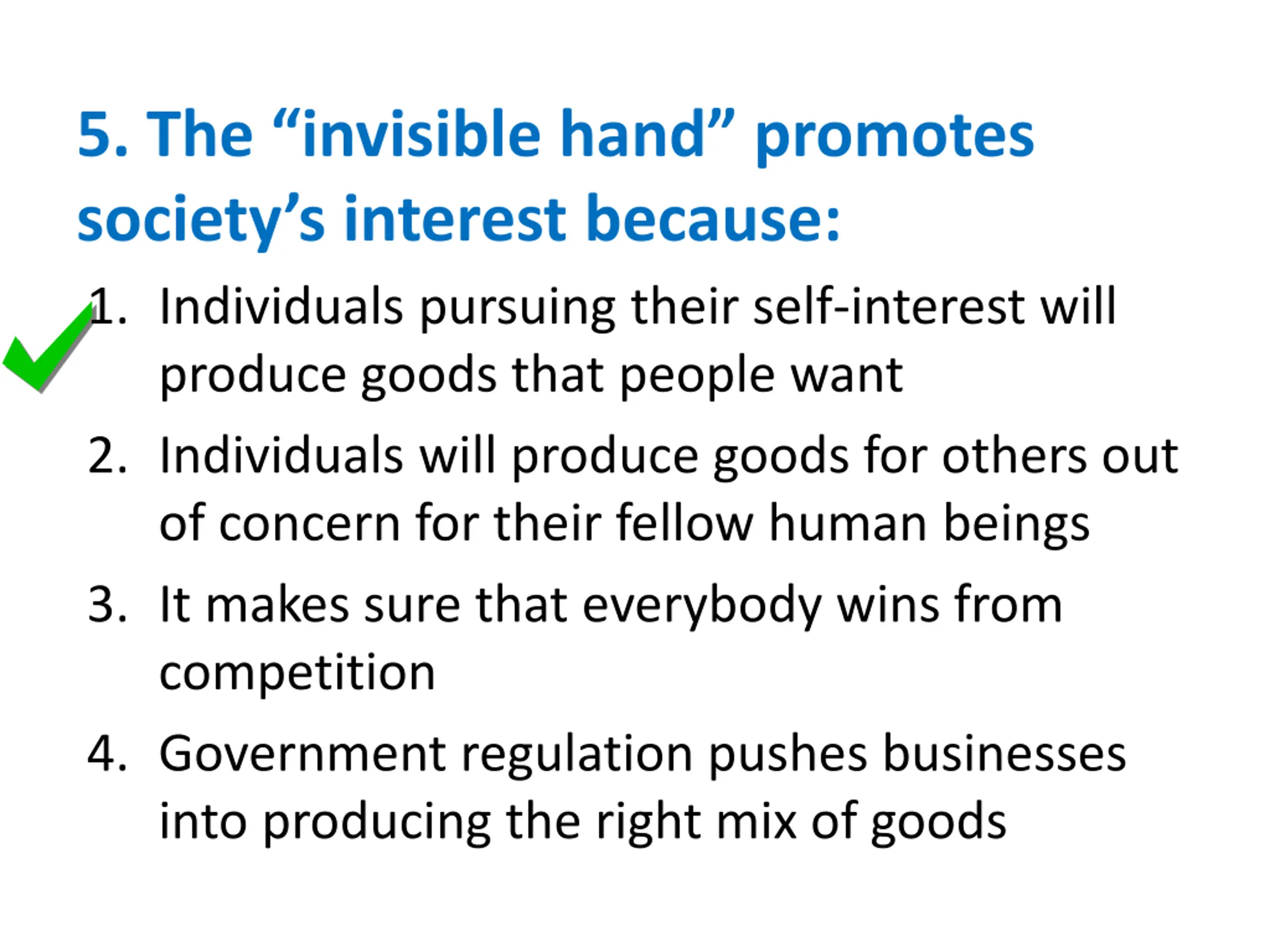 5. The invisible hand promotes society s interest because: 1. Individuals pursuing their self-interest will produce goods that people want 2. Individuals will produce goods for others out of concern for their fellow human beings 3. It makes sure that everybody wins from competition 4. Government regulation pushes businesses into producing the right mix of goods