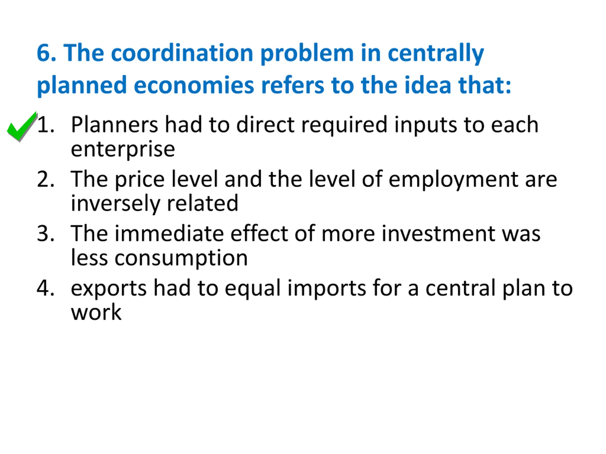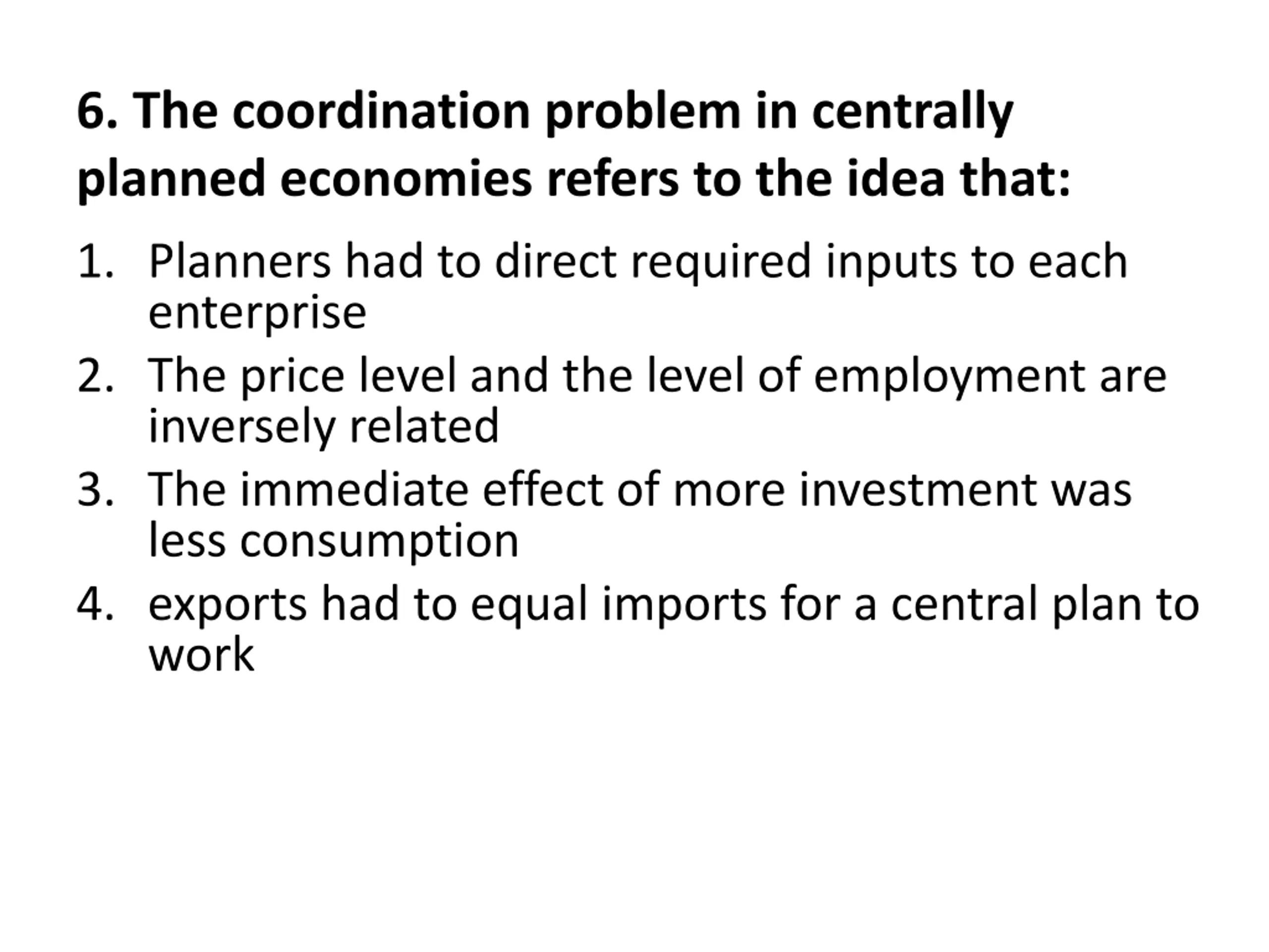 6. The coordination problem in centrally planned economies refers to the idea that: 1. Planners had to direct required inputs to each enterprise 2. The price level and the level of employment are inversely related 3. The immediate effect of more investment was less consumption 4. exports had to equal imports for a central plan to work