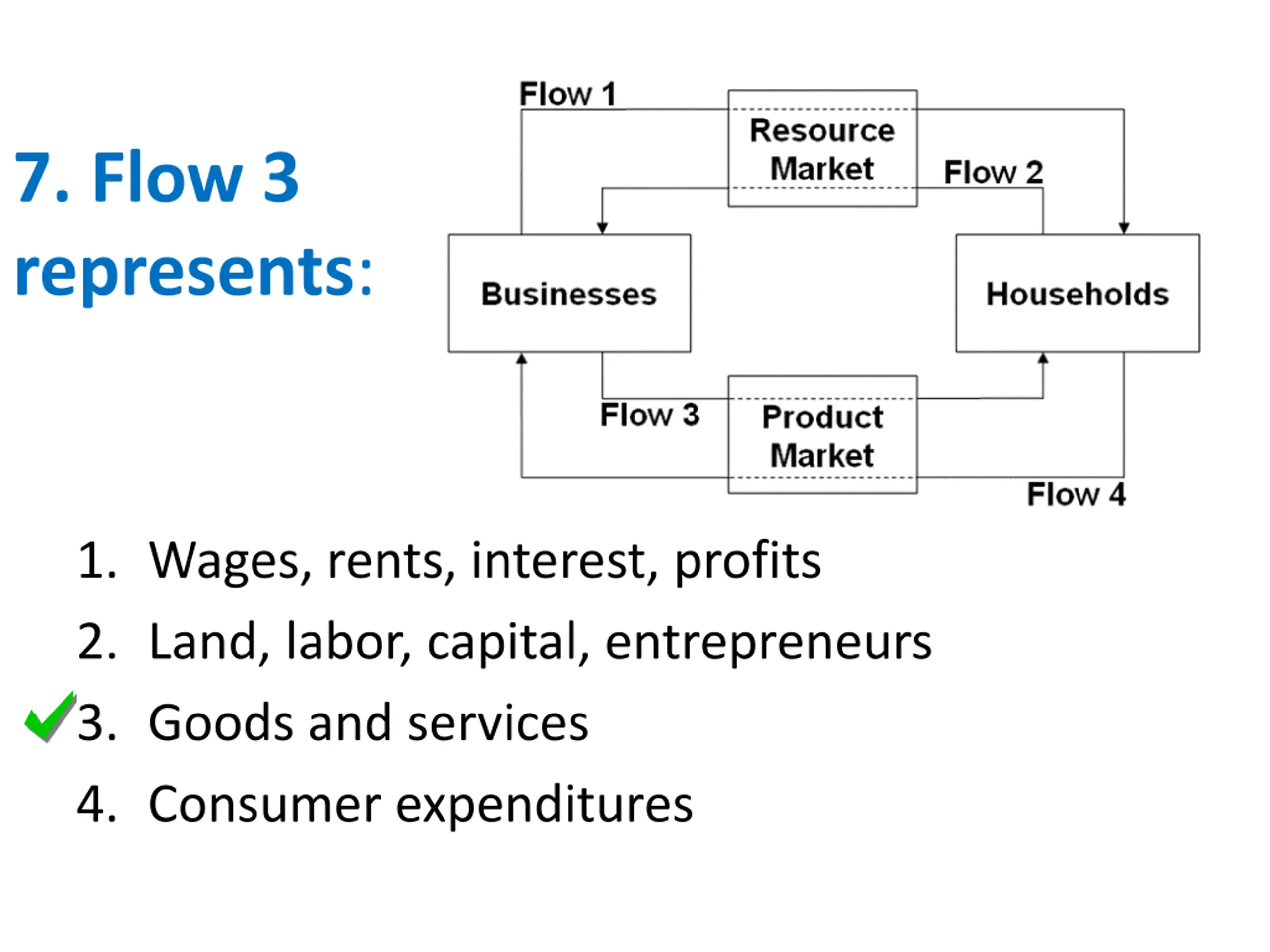 7. Flow 3 represents: 1. Wages, rents, interest, profits 2. Land, labor, capital, entrepreneurs 3. Goods and services 4. Consumer expenditures