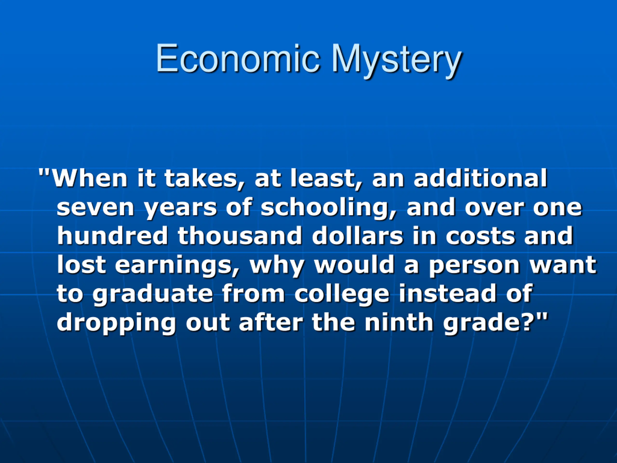 Economic Mystery "When it takes, at least, an additional seven years of schooling, and over one hundred thousand dollars in costs and lost earnings, why would a person want to graduate from college instead of dropping out after the ninth grade?"