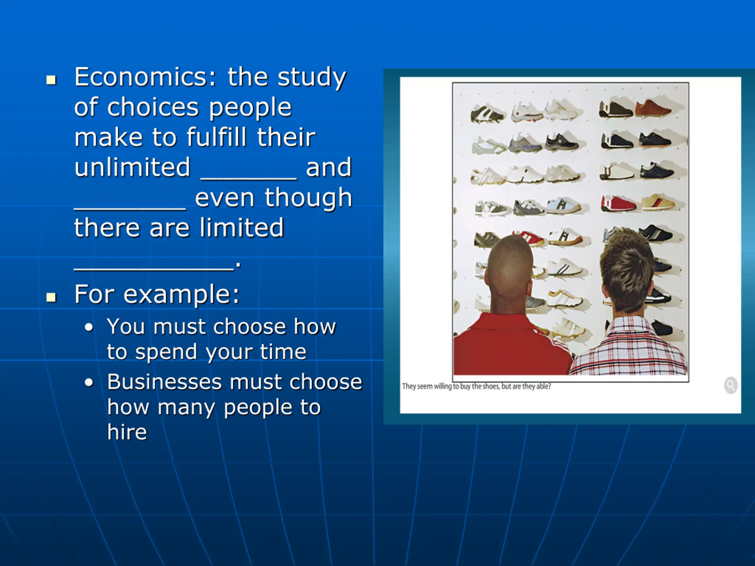 Economics: the study of choices people make to fulfill their unlimited ______ and _______ even though there are limited __________. For example: You must choose how to spend your time Businesses must choose how many people to hire