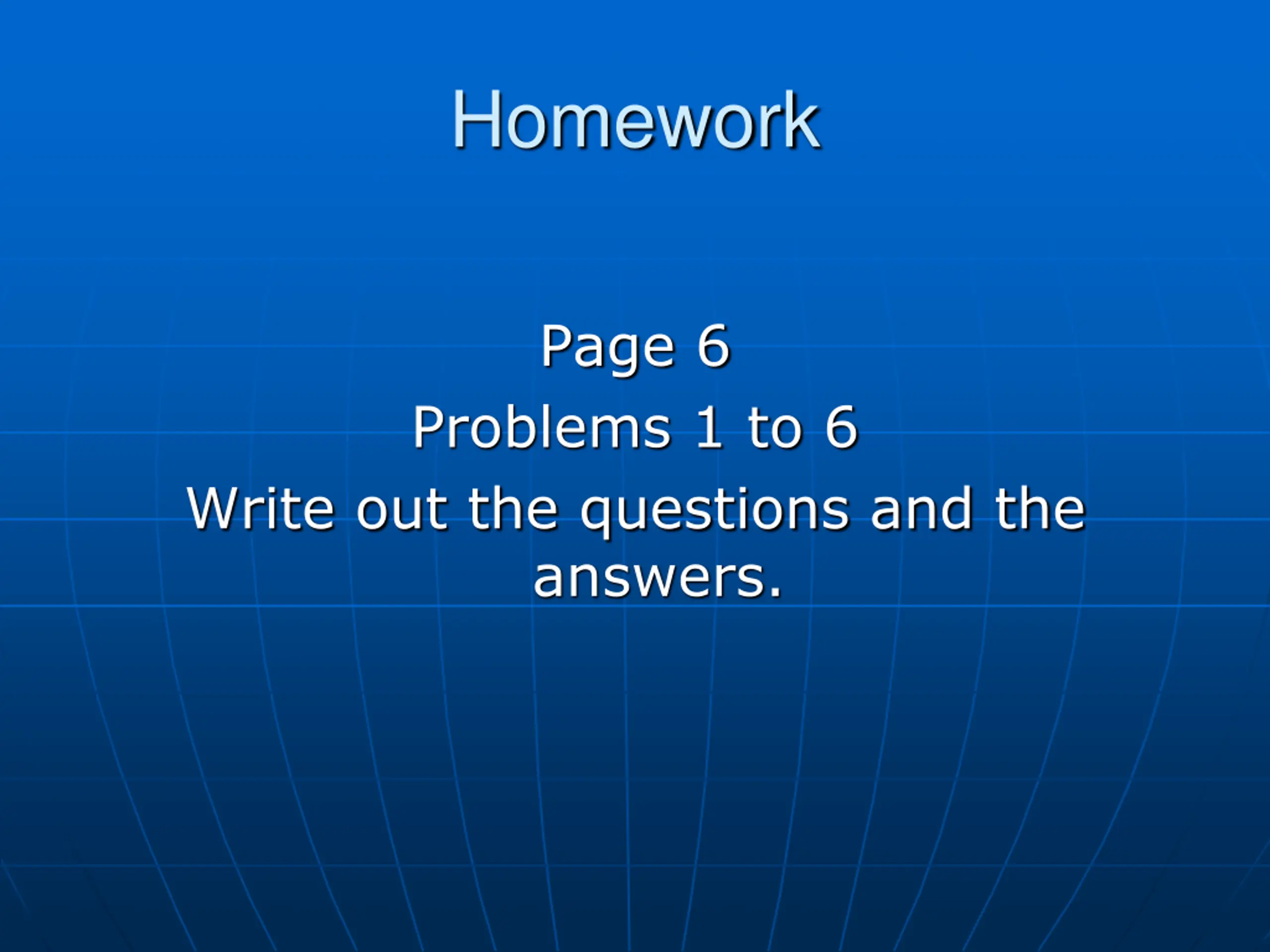 Homework Page 6 Problems 1 to 6 Write out the questions and the answers.
