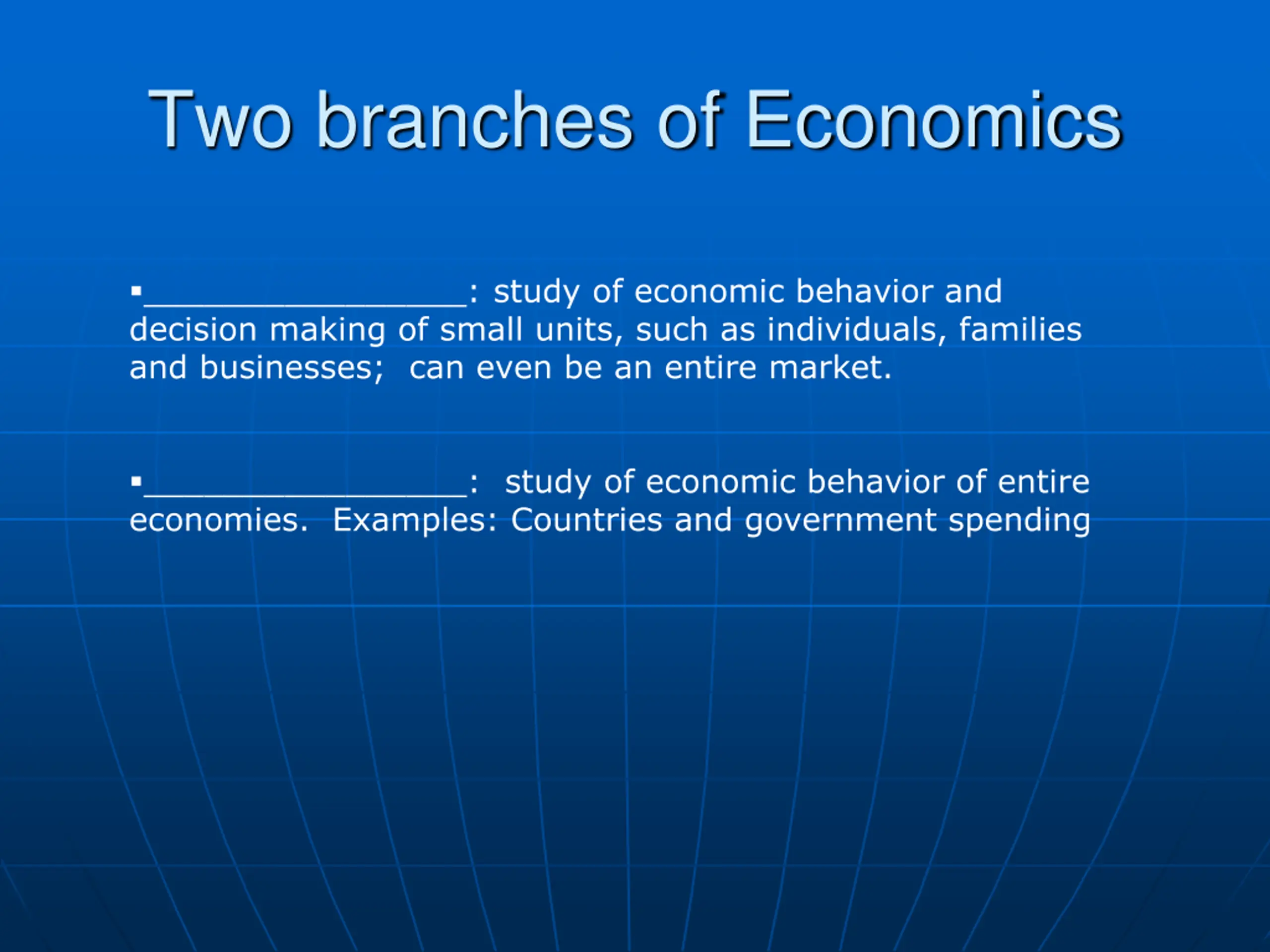 Two branches of Economics ________________: study of economic behavior and decision making of small units, such as individuals, families and businesses; can even be an entire market. ________________: study of economic behavior of entire economies. Examples: Countries and government spending