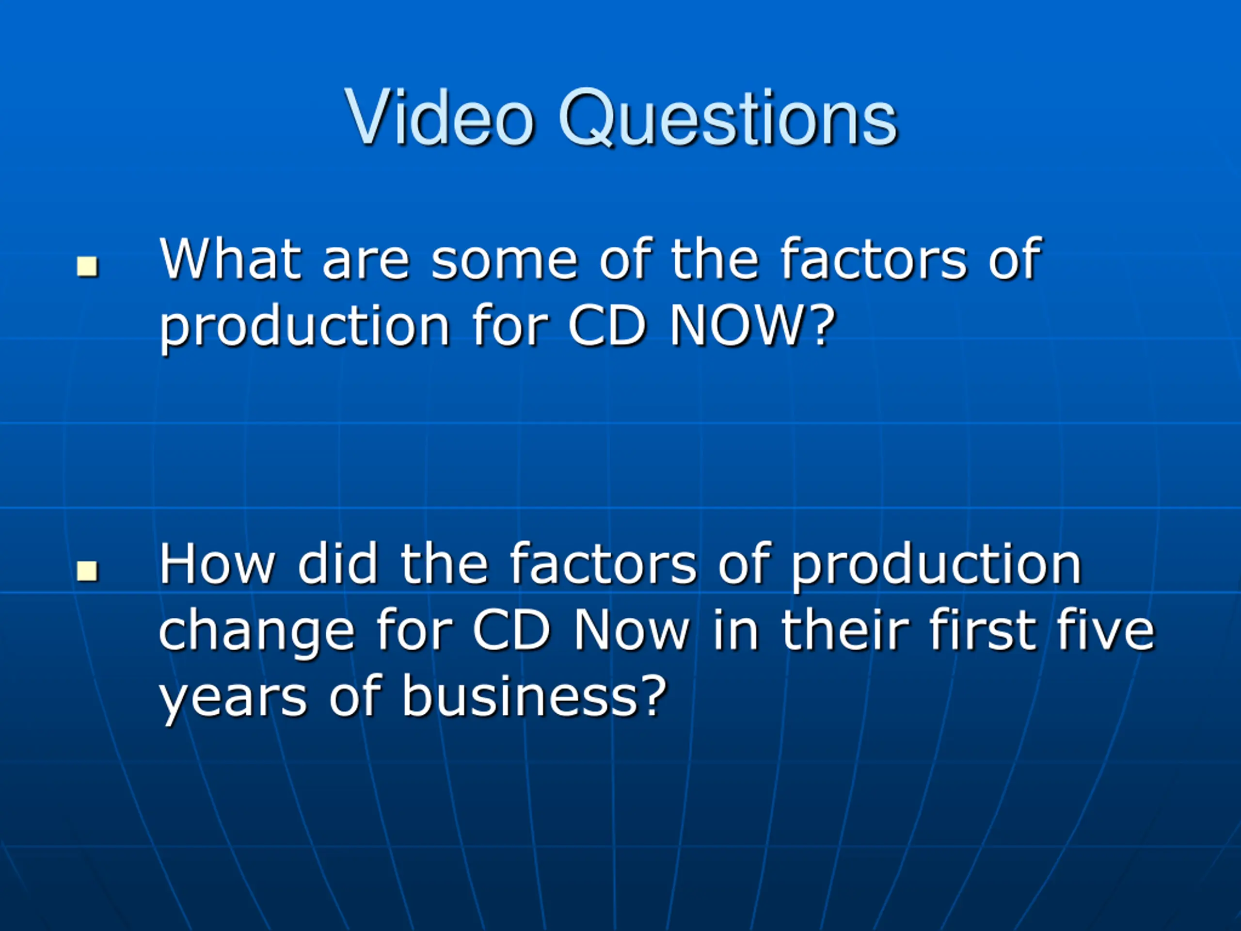 Video Questions What are some of the factors of production for CD NOW? How did the factors of production change for CD Now in their first five years of business?