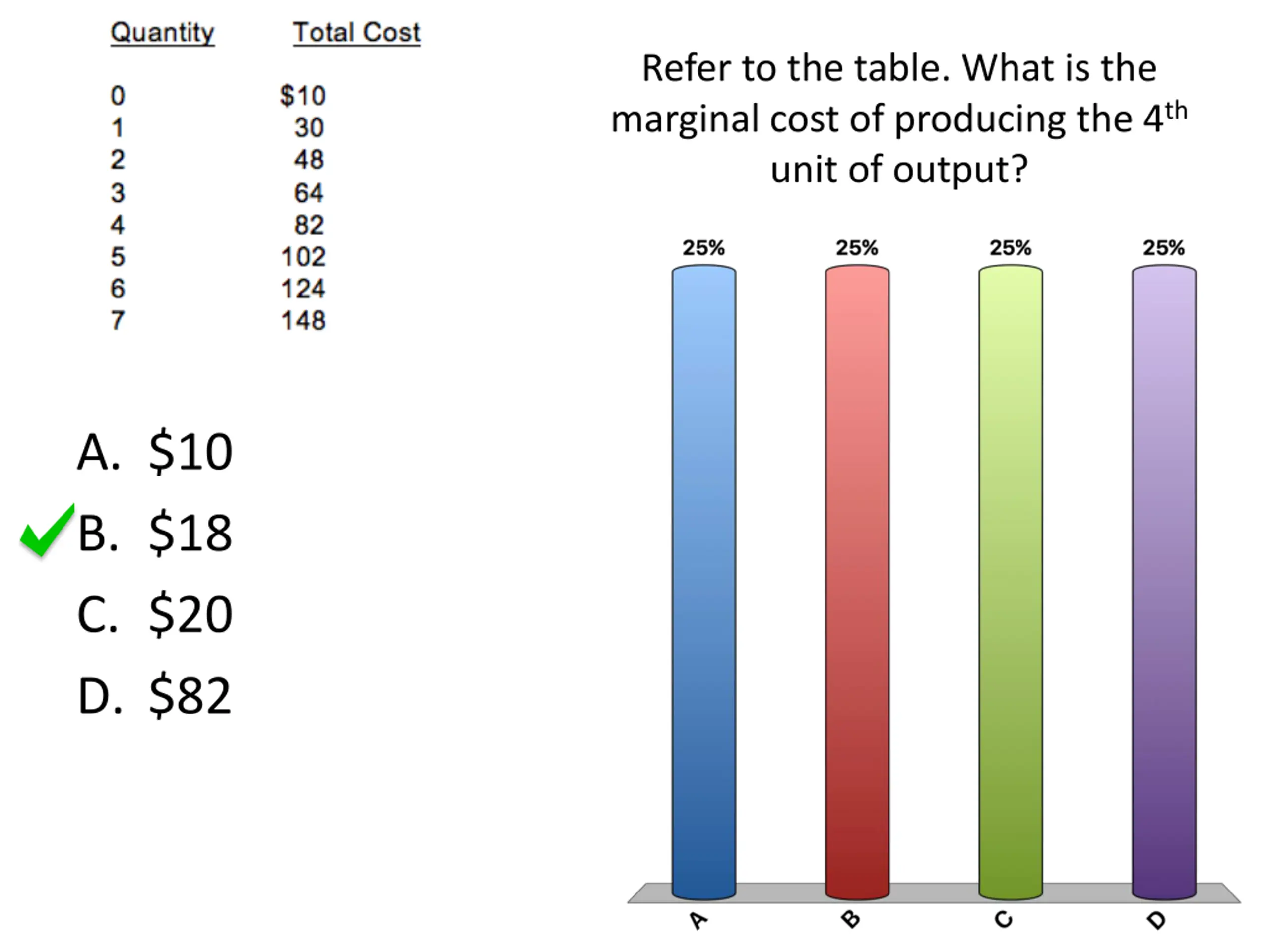 Refer to the table. What is the marginal cost of producing the 4th unit of output? A. $10 B. $18 C. $20 D. $82