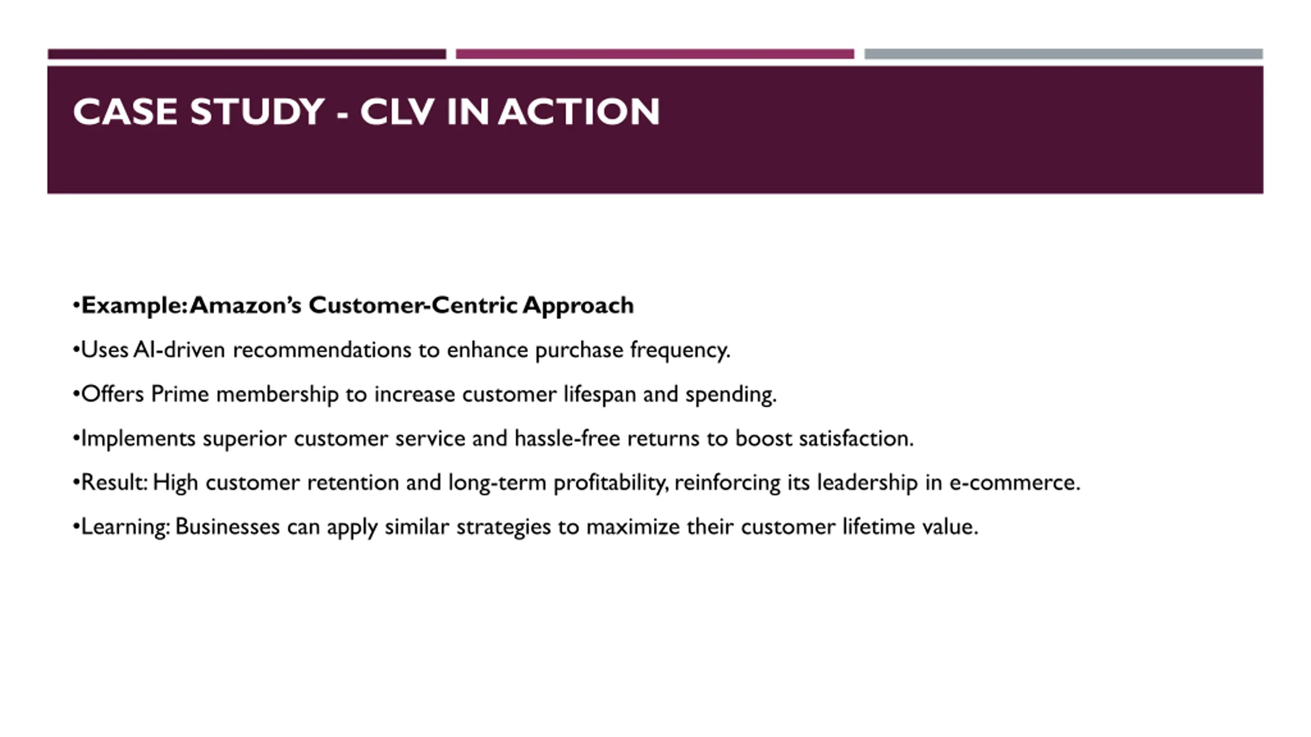CASE STUDY - CLV IN ACTION Example: Amazon s Customer-Centric Approach Uses AI-driven recommendations to enhance purchase frequency. Offers Prime membership to increase customer lifespan and spending. Implements superior customer service and hassle-free returns to boost satisfaction. Result: High customer retention and long-term profitability, reinforcing its leadership in e-commerce. Learning: Businesses can apply similar strategies to maximize their customer lifetime value.