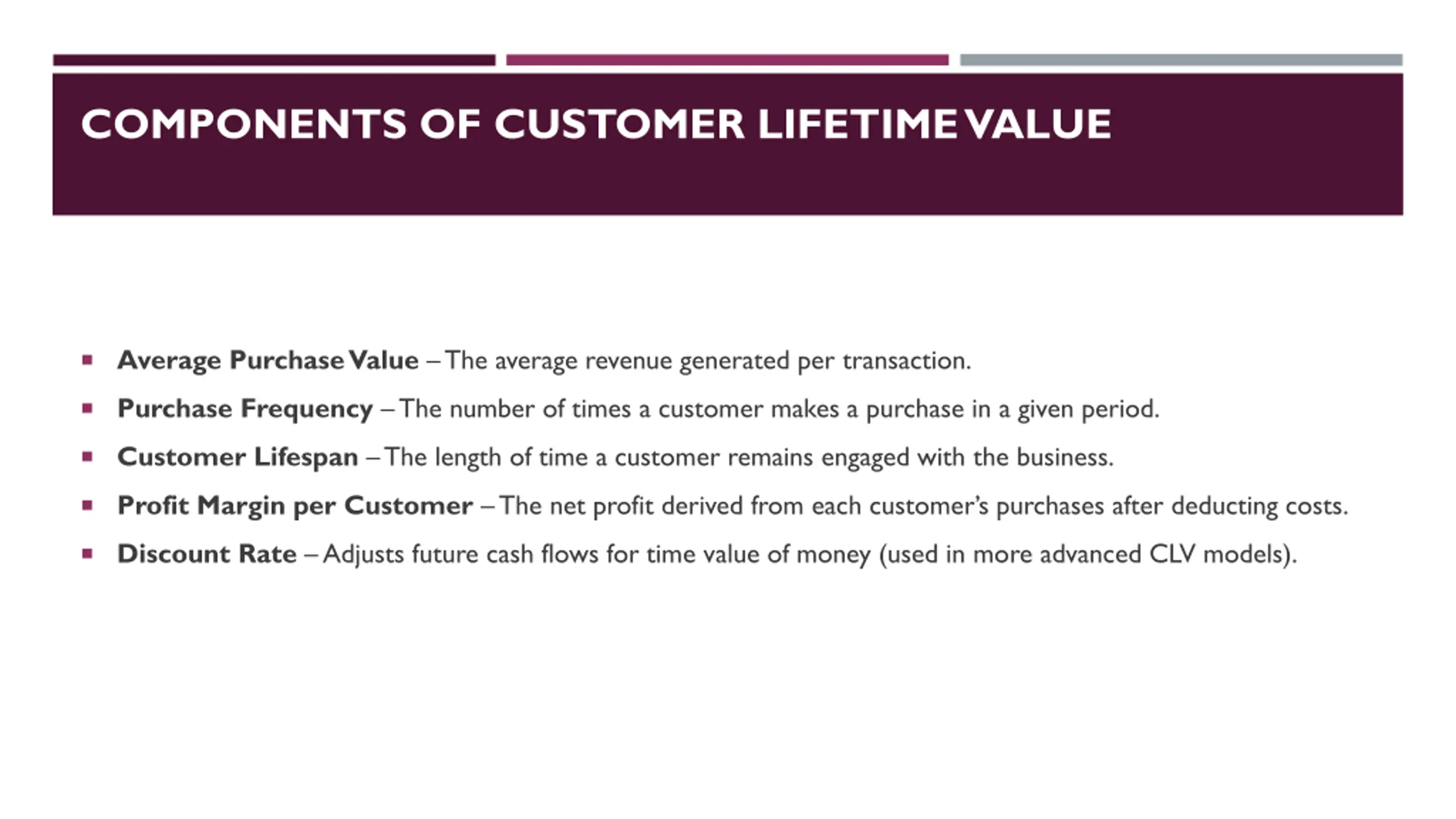 COMPONENTS OF CUSTOMER LIFETIME VALUE Average Purchase Value The average revenue generated per transaction. Purchase Frequency The number of times a customer makes a purchase in a given period. Customer Lifespan The length of time a customer remains engaged with the business. Profit Margin per Customer The net profit derived from each customer s purchases after deducting costs. Discount Rate Adjusts future cash flows for time value of money (used in more advanced CLV models).