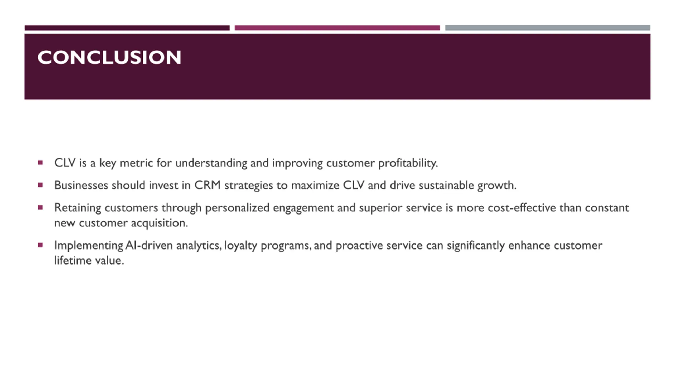 CONCLUSION CLV is a key metric for understanding and improving customer profitability. Businesses should invest in CRM strategies to maximize CLV and drive sustainable growth. Retaining customers through personalized engagement and superior service is more cost-effective than constant new customer acquisition. Implementing AI-driven analytics, loyalty programs, and proactive service can significantly enhance customer lifetime value.