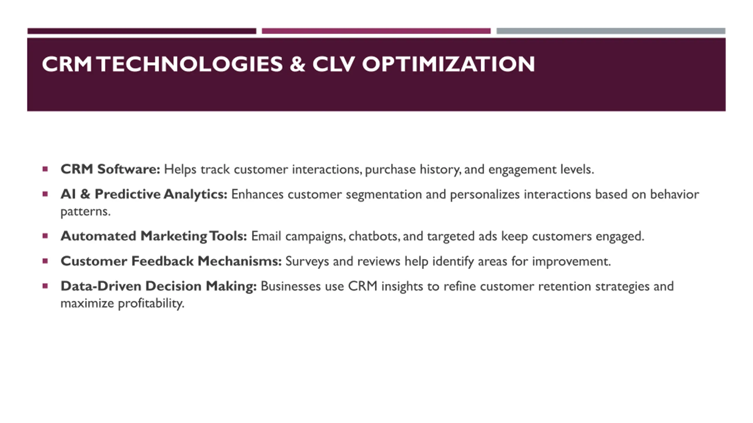 CRM TECHNOLOGIES & CLV OPTIMIZATION CRM Software: Helps track customer interactions, purchase history, and engagement levels. AI & Predictive Analytics: Enhances customer segmentation and personalizes interactions based on behavior patterns. Automated Marketing Tools: Email campaigns, chatbots, and targeted ads keep customers engaged. Customer Feedback Mechanisms: Surveys and reviews help identify areas for improvement. Data-Driven Decision Making: Businesses use CRM insights to refine customer retention strategies and maximize profitability.