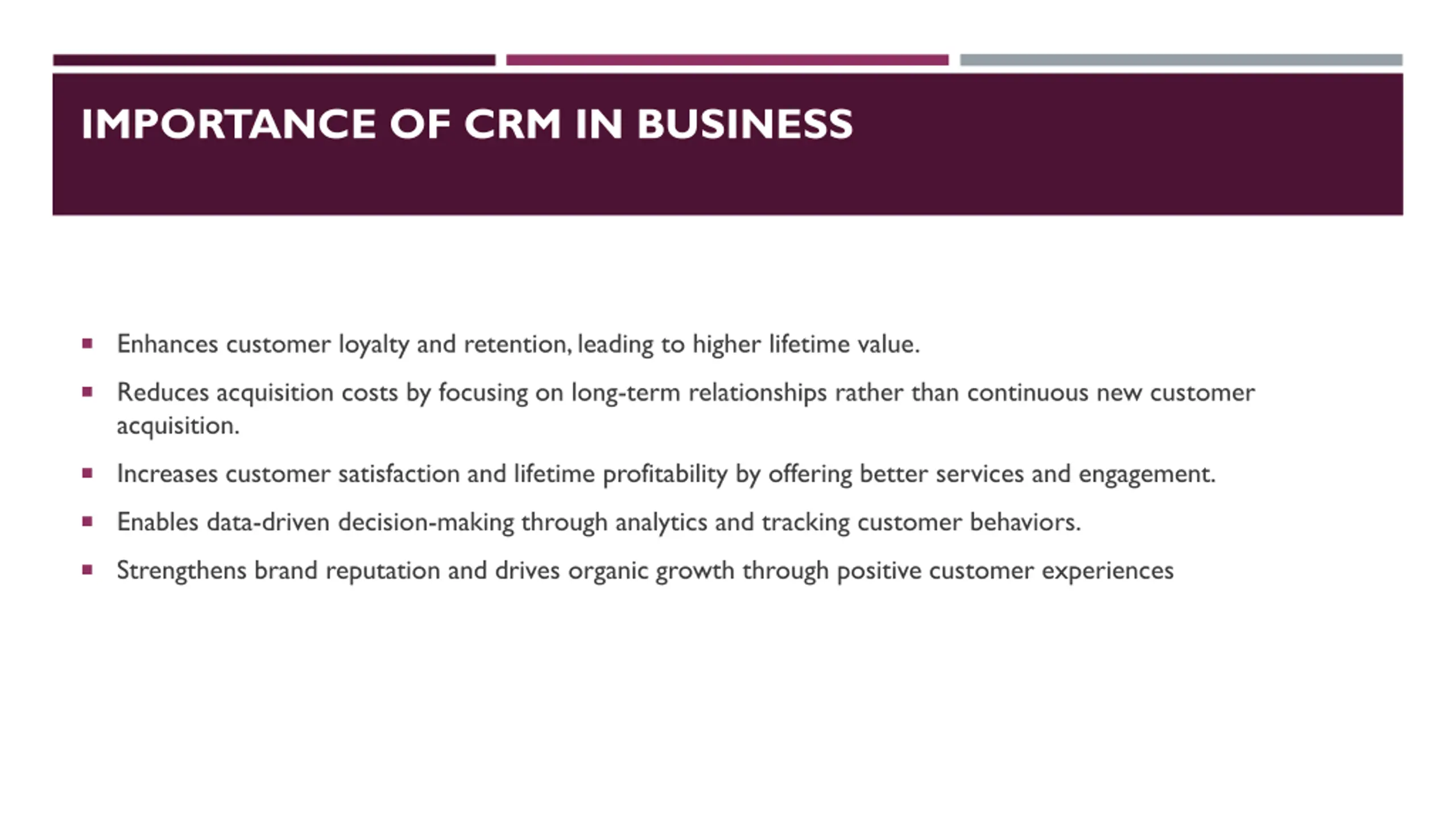 IMPORTANCE OF CRM IN BUSINESS Enhances customer loyalty and retention, leading to higher lifetime value. Reduces acquisition costs by focusing on long-term relationships rather than continuous new customer acquisition. Increases customer satisfaction and lifetime profitability by offering better services and engagement. Enables data-driven decision-making through analytics and tracking customer behaviors. Strengthens brand reputation and drives organic growth through positive customer experiences