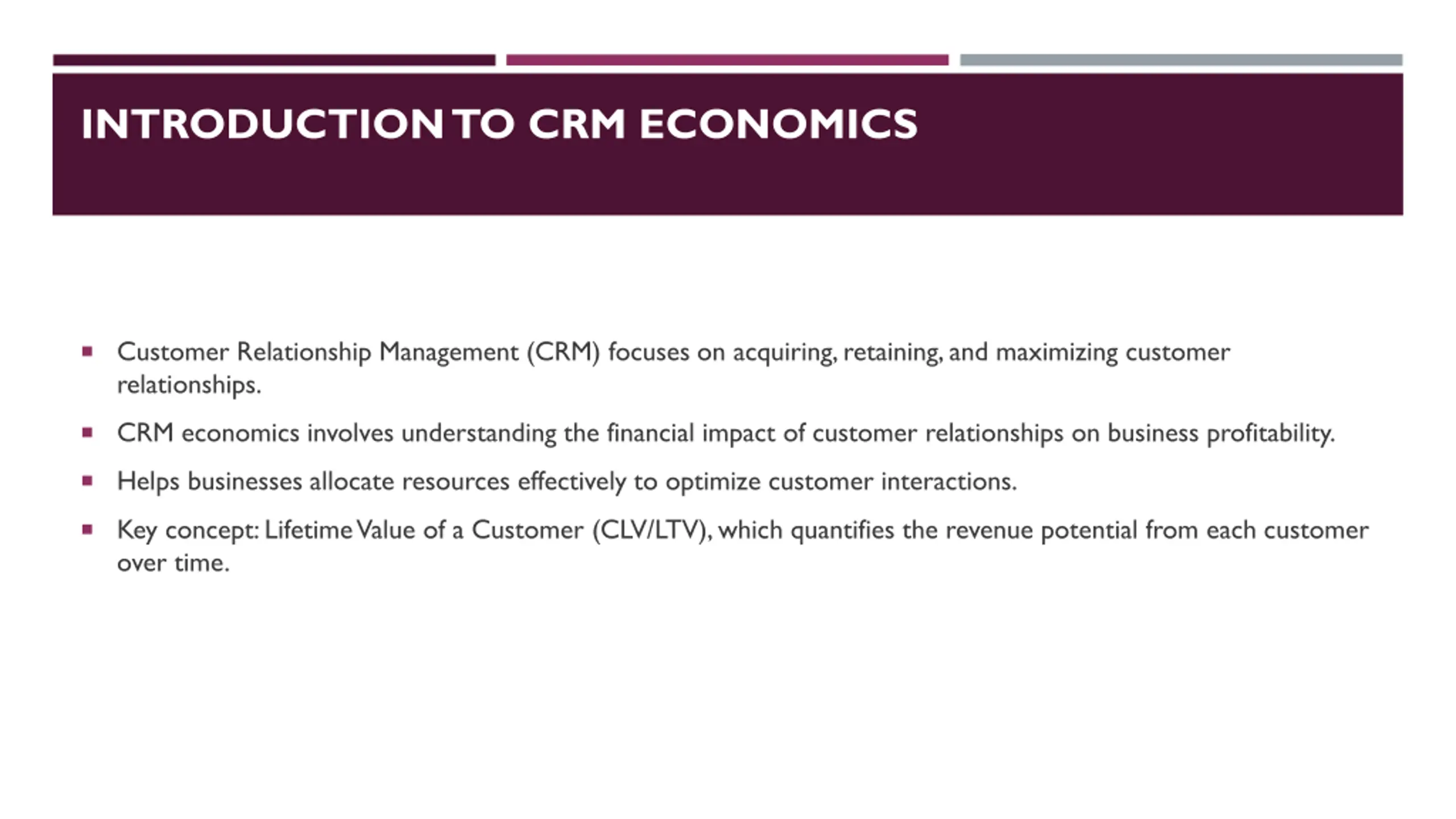 INTRODUCTION TO CRM ECONOMICS Customer Relationship Management (CRM) focuses on acquiring, retaining, and maximizing customer relationships. CRM economics involves understanding the financial impact of customer relationships on business profitability. Helps businesses allocate resources effectively to optimize customer interactions. Key concept: Lifetime Value of a Customer (CLV/LTV), which quantifies the revenue potential from each customer over time.