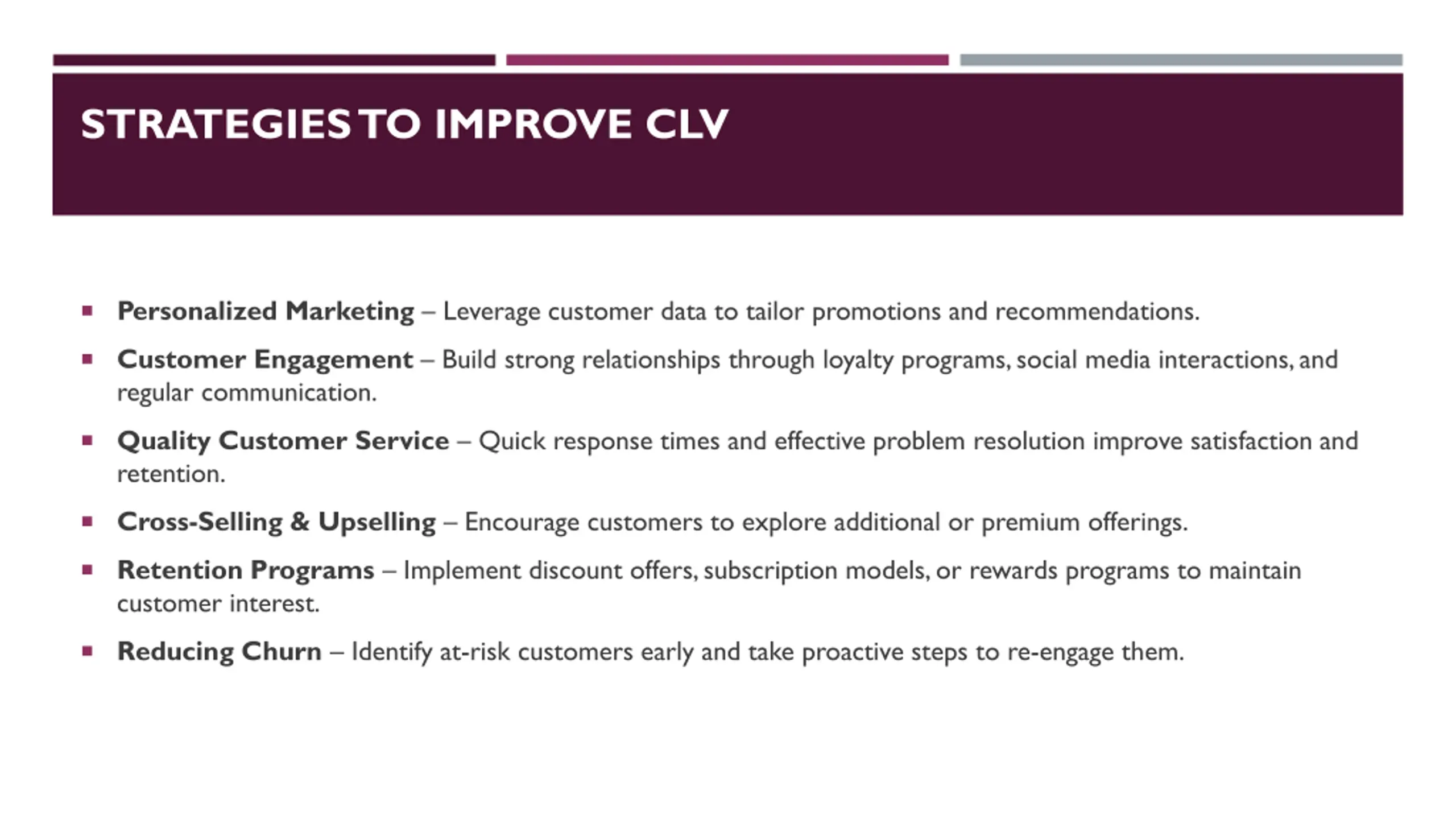 STRATEGIES TO IMPROVE CLV Personalized Marketing Leverage customer data to tailor promotions and recommendations. Customer Engagement Build strong relationships through loyalty programs, social media interactions, and regular communication. Quality Customer Service Quick response times and effective problem resolution improve satisfaction and retention. Cross-Selling & Upselling Encourage customers to explore additional or premium offerings. Retention Programs Implement discount offers, subscription models, or rewards programs to maintain customer interest. Reducing Churn Identify at-risk customers early and take proactive steps to re-engage them.