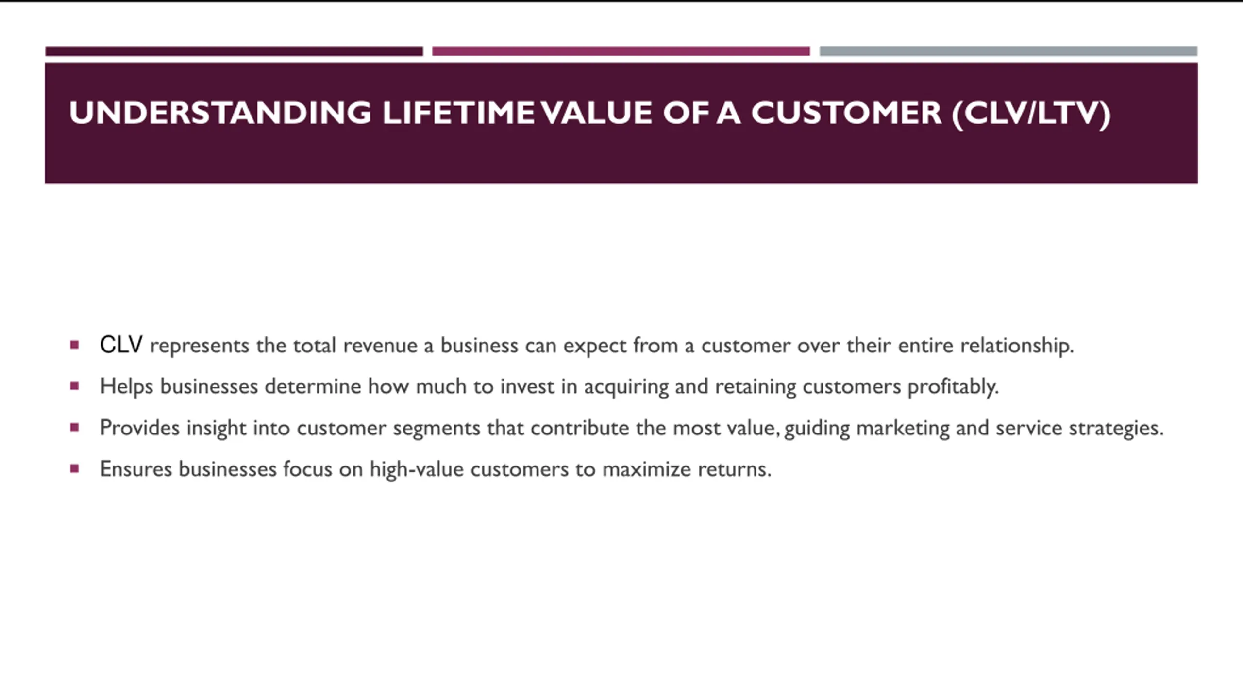 UNDERSTANDING LIFETIME VALUE OF A CUSTOMER (CLV/LTV) CLV represents the total revenue a business can expect from a customer over their entire relationship. Helps businesses determine how much to invest in acquiring and retaining customers profitably. Provides insight into customer segments that contribute the most value, guiding marketing and service strategies. Ensures businesses focus on high-value customers to maximize returns.