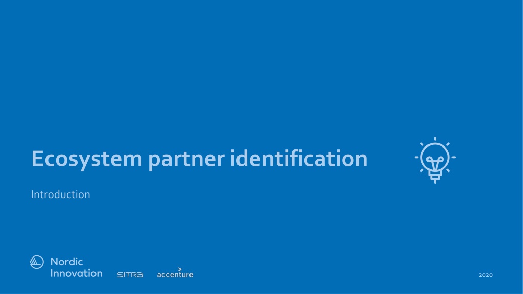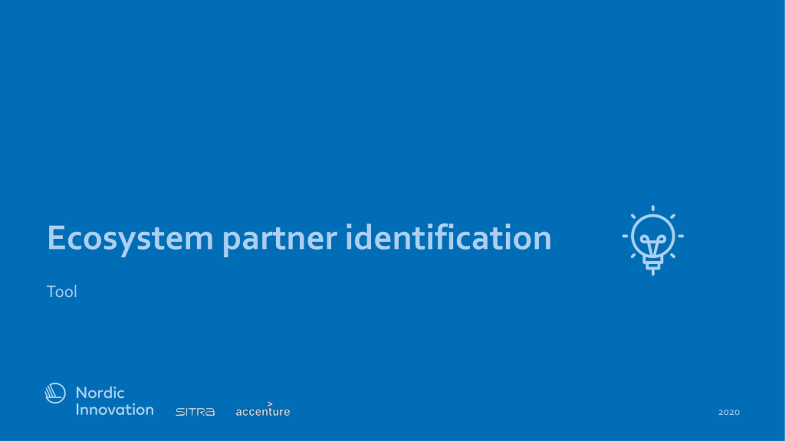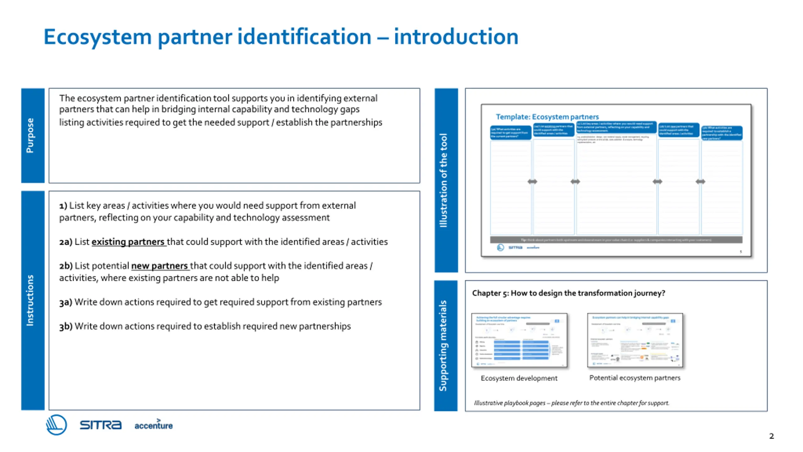 Ecosystem partner identification introduction The ecosystem partner identification tool supports you in identifying external partners that can help in bridging internal capability and technology gaps listing activities required to get the needed support / establish the partnerships Purpose Illustration of the tool 1) List key areas / activities where you would need support from external partners, reflecting on your capability and technology assessment 2a) List existing partners that could support with the identified areas / activities 2b) List potential new partners that could support with the identified areas / activities, where existing partners are not able to help Instructions Chapter 5: How to design the transformation journey? 3a) Write down actions required to get required support from existing partners Supporting materials 3b) Write down actions required to establish required new partnerships Potential ecosystem partners Ecosystem development Illustrative playbook pages please refer to the entire chapter for support. 2