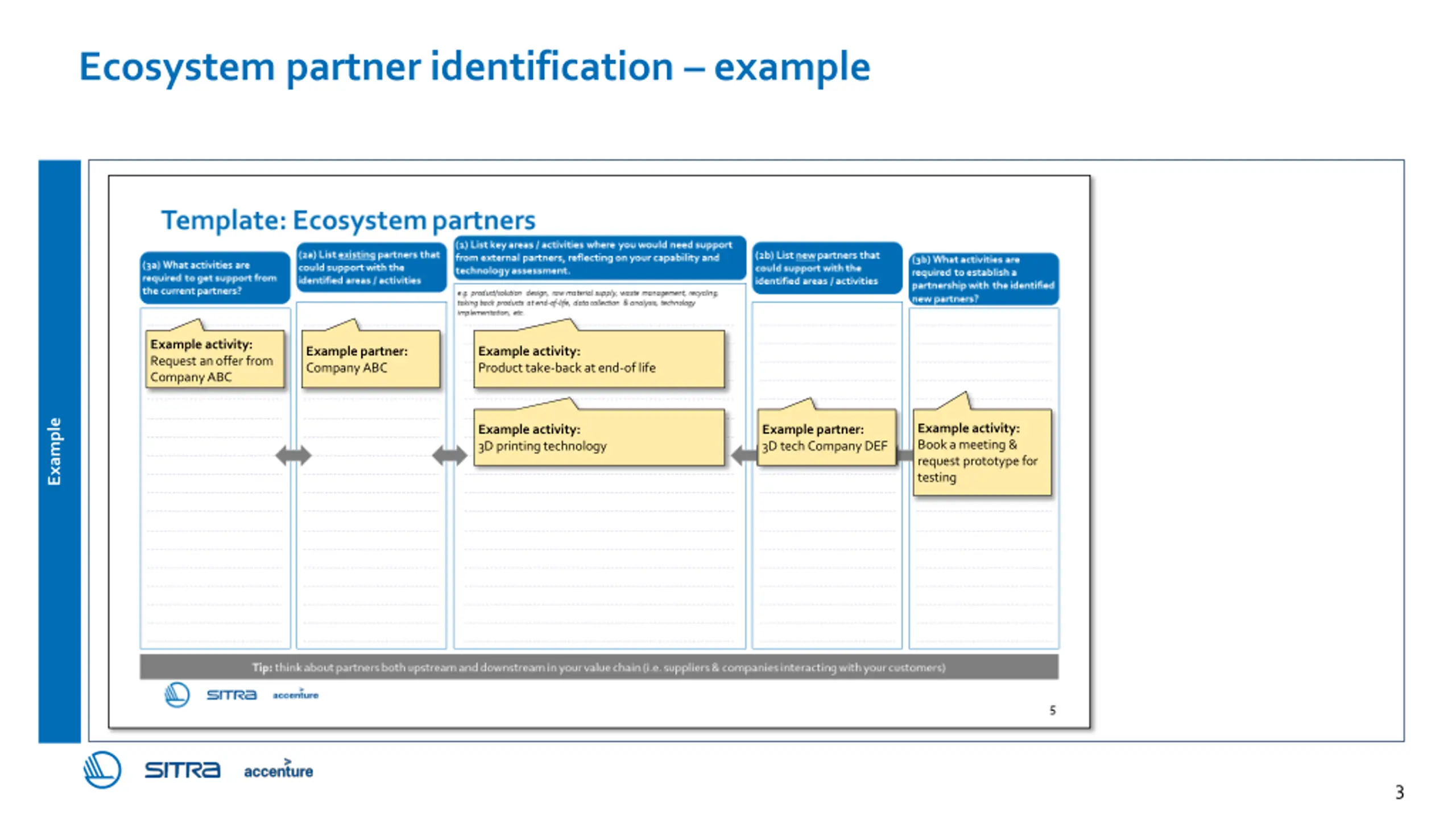 Ecosystem partner identification example Example activity: Request an offer from Company ABC Example partner: Company ABC Example activity: Product take-back at end-of life Example Example activity: Book a meeting & request prototype for testing Example activity: 3D printing technology Example partner: 3D tech Company DEF 3