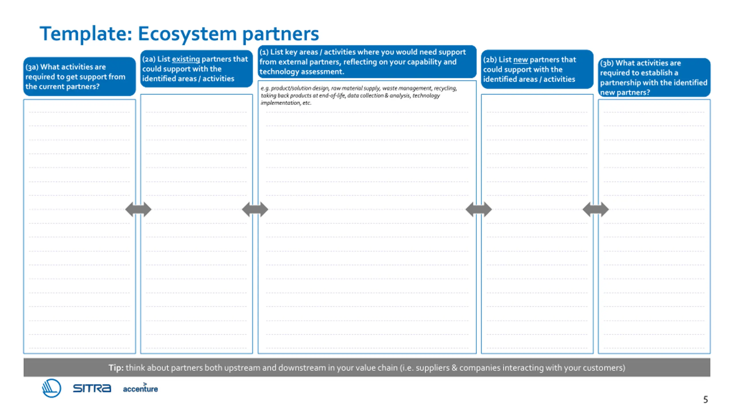 Template: Ecosystem partners (1) List key areas / activities where you would need support from external partners, reflecting on your capability and technology assessment. (2a) List existing partners that could support with the identified areas / activities (2b) List new partners that could support with the identified areas / activities (3b) What activities are required to establish a partnership with the identified new partners? (3a) What activities are required to get support from the current partners? e.g. product/solution design, raw material supply, waste management, recycling, taking back products at end-of-life, data collection & analysis, technology implementation, etc. Tip: think about partners both upstream and downstream in your value chain (i.e. suppliers & companies interacting with your customers) 5