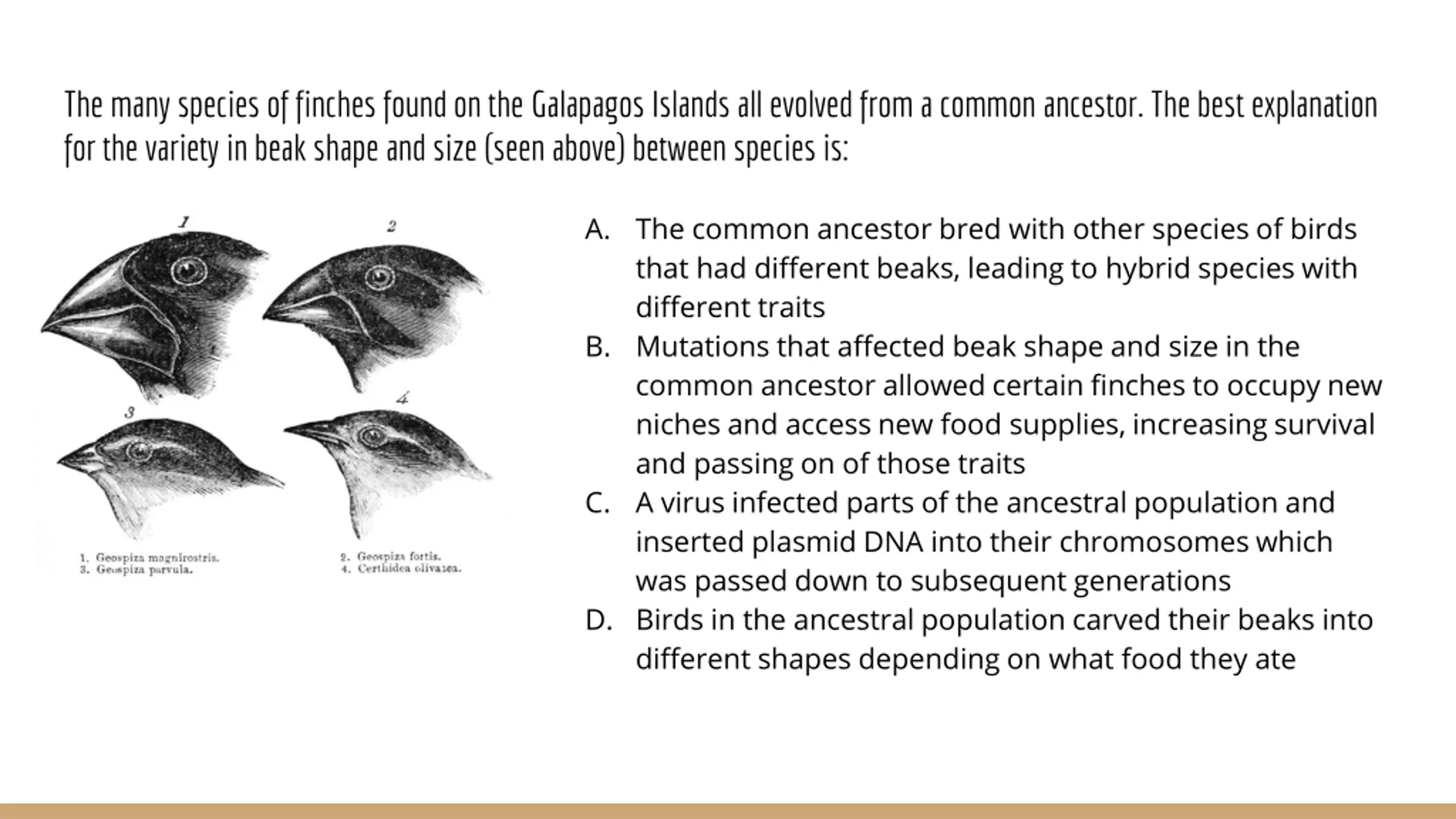 The many species of finches found on the Galapagos Islands all evolved from a common ancestor. The best explanation for the variety in beak shape and size (seen above) between species is: A. The common ancestor bred with other species of birds that had different beaks, leading to hybrid species with different traits B. Mutations that affected beak shape and size in the common ancestor allowed certain finches to occupy new niches and access new food supplies, increasing survival and passing on of those traits C. A virus infected parts of the ancestral population and inserted plasmid DNA into their chromosomes which was passed down to subsequent generations D. Birds in the ancestral population carved their beaks into different shapes depending on what food they ate