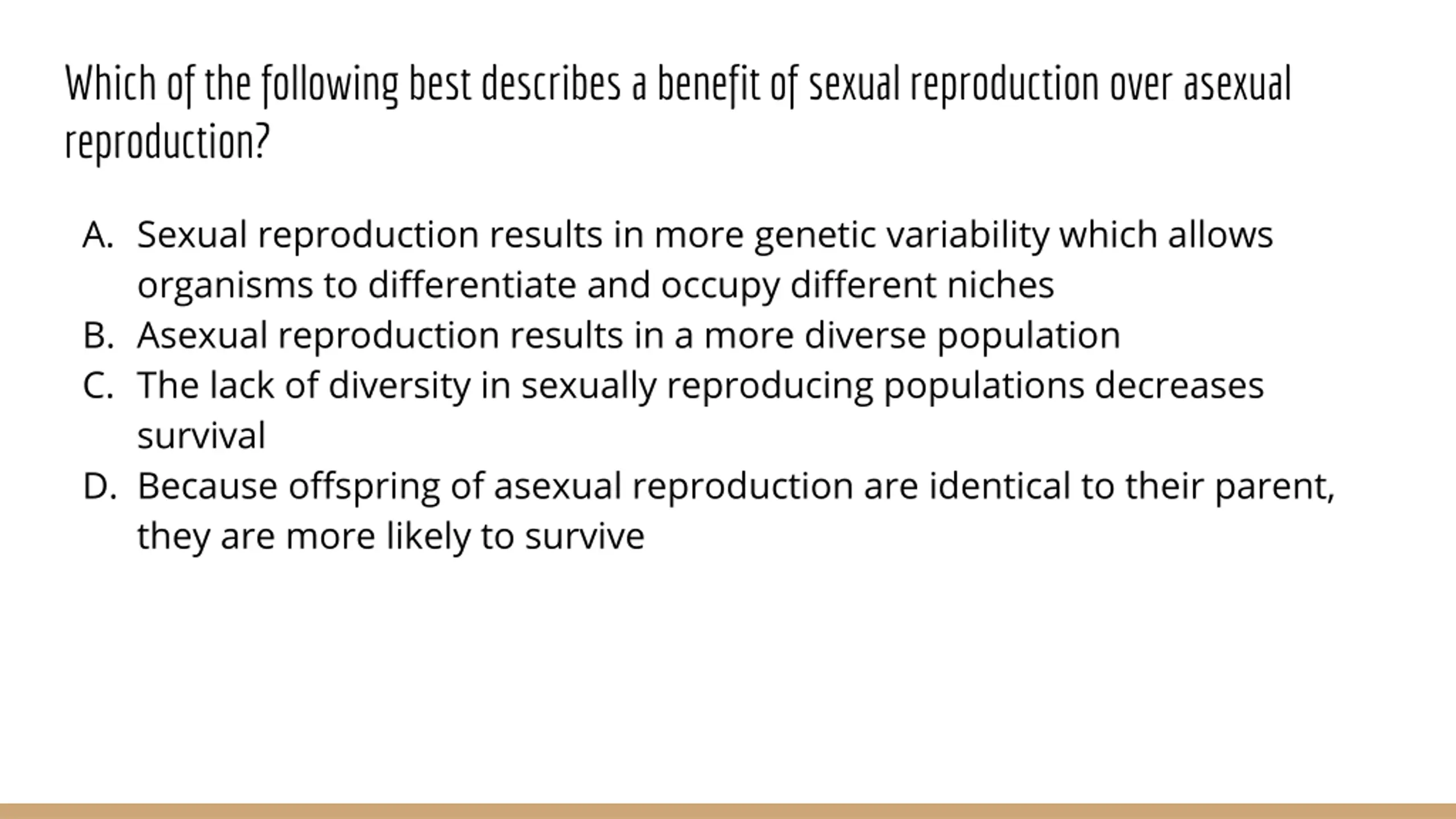 Which of the following best describes a benefit of sexual reproduction over asexual reproduction? A. Sexual reproduction results in more genetic variability which allows organisms to differentiate and occupy different niches B. Asexual reproduction results in a more diverse population C. The lack of diversity in sexually reproducing populations decreases survival D. Because offspring of asexual reproduction are identical to their parent, they are more likely to survive