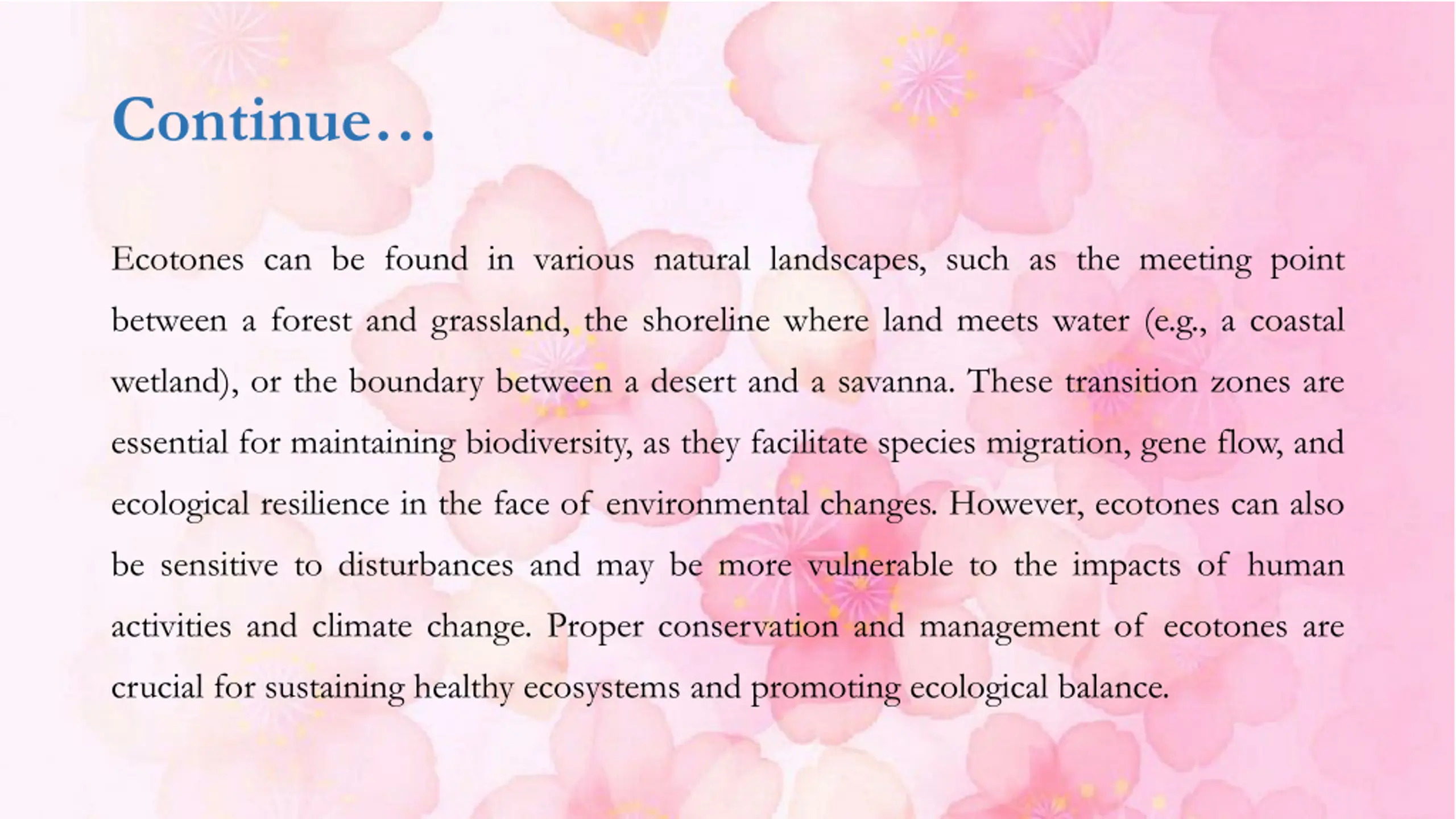 Continue Ecotones can be found in various natural landscapes, such as the meeting point between a forest and grassland, the shoreline where land meets water (e.g., a coastal wetland), or the boundary between a desert and a savanna. These transition zones are essential for maintaining biodiversity, as they facilitate species migration, gene flow, and ecological resilience in the face of environmental changes. However, ecotones can also be sensitive to disturbances and may be more vulnerable to the impacts of human activities and climate change. Proper conservation and management of ecotones are crucial for sustaining healthy ecosystems and promoting ecological balance.