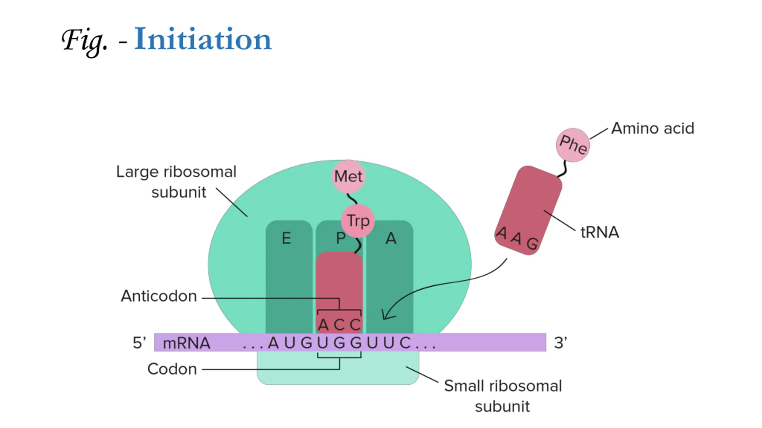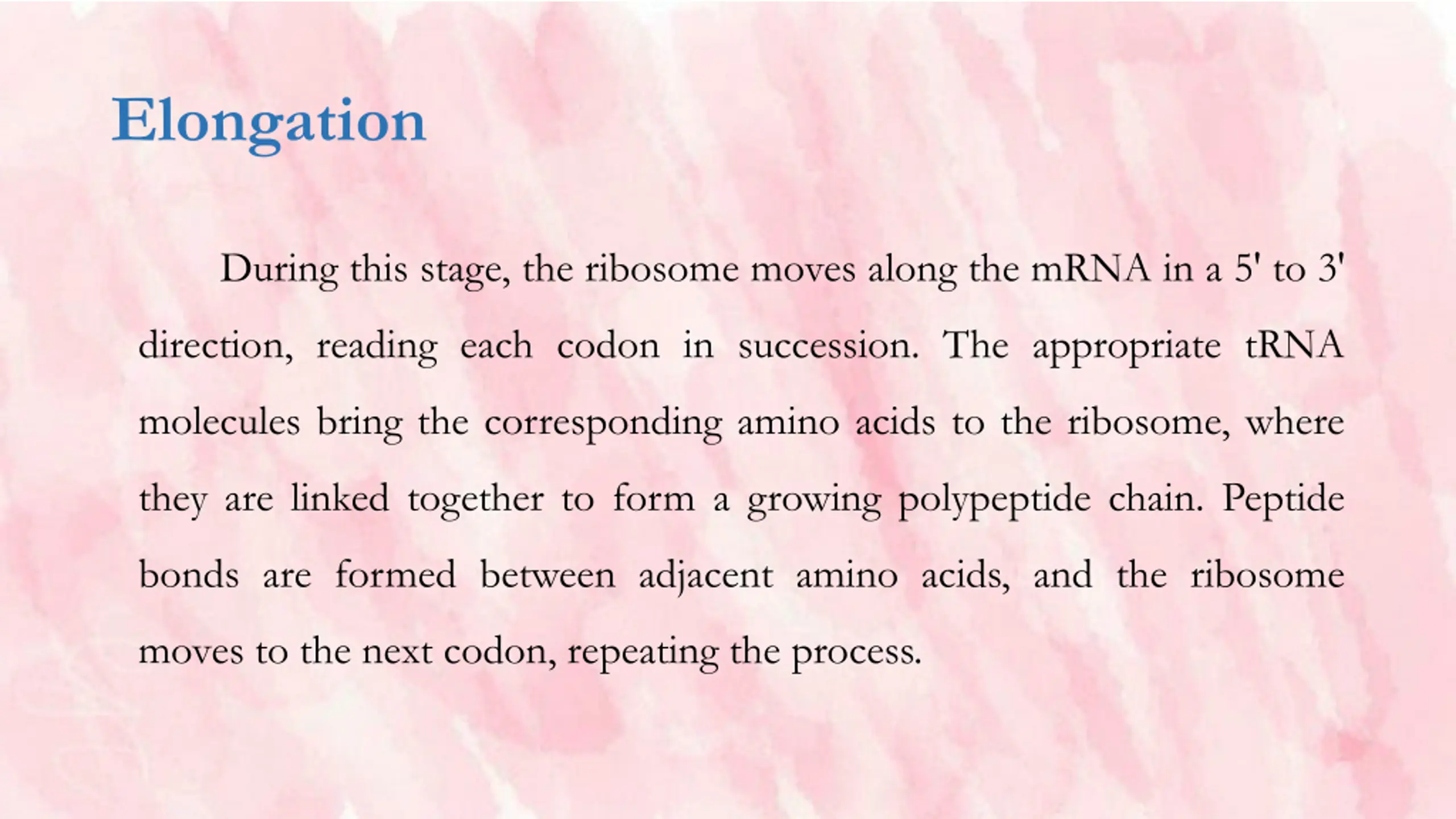 Elongation During this stage, the ribosome moves along the mRNA in a 5' to 3' direction, reading each codon in succession. The appropriate tRNA molecules bring the corresponding amino acids to the ribosome, where they are linked together to form a growing polypeptide chain. Peptide bonds are formed between adjacent amino acids, and the ribosome moves to the next codon, repeating the process.