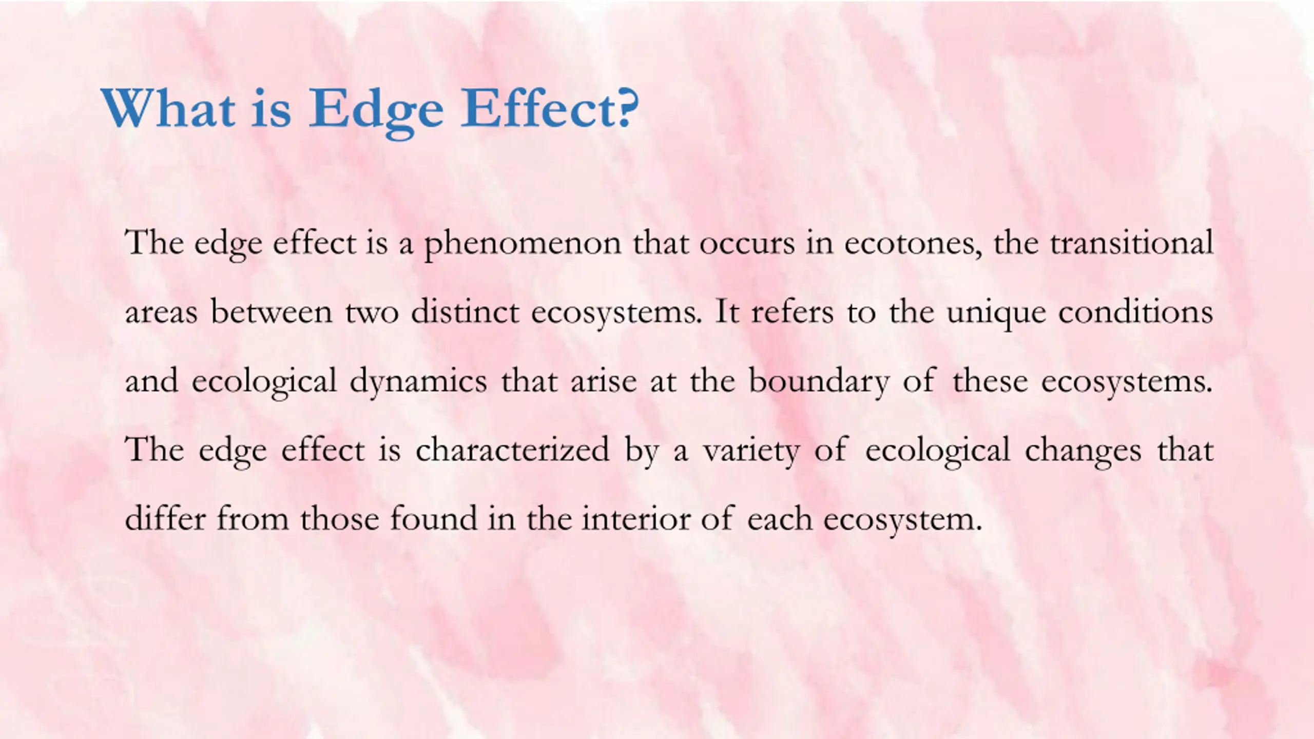 What is Edge Effect? The edge effect is a phenomenon that occurs in ecotones, the transitional areas between two distinct ecosystems. It refers to the unique conditions and ecological dynamics that arise at the boundary of these ecosystems. The edge effect is characterized by a variety of ecological changes that differ from those found in the interior of each ecosystem.