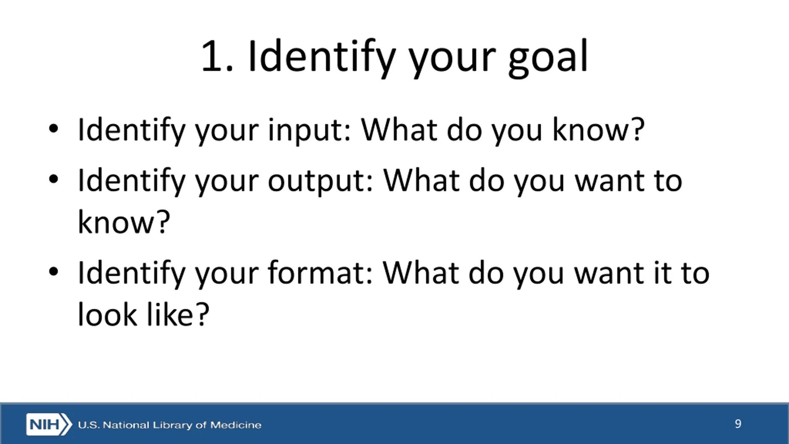 1. Identify your goal Identify your input: What do you know? Identify your output: What do you want to know? Identify your format: What do you want it to look like? 9