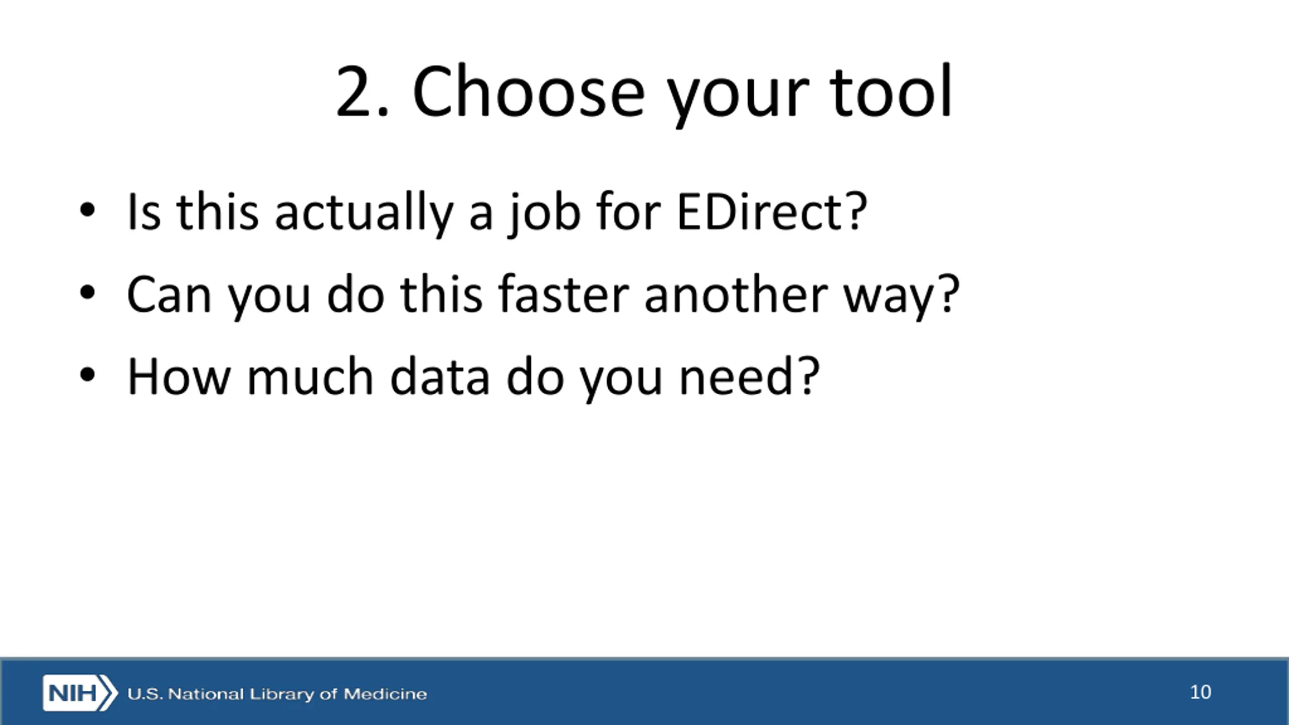 2. Choose your tool Is this actually a job for EDirect? Can you do this faster another way? How much data do you need? 10