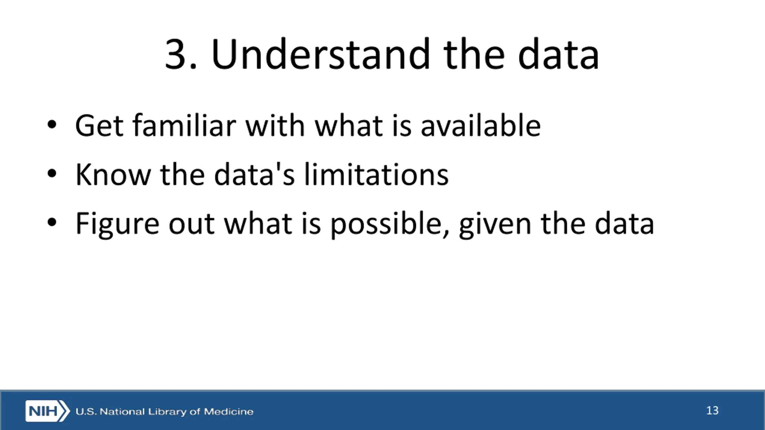 3. Understand the data Get familiar with what is available Know the data's limitations Figure out what is possible, given the data 13
