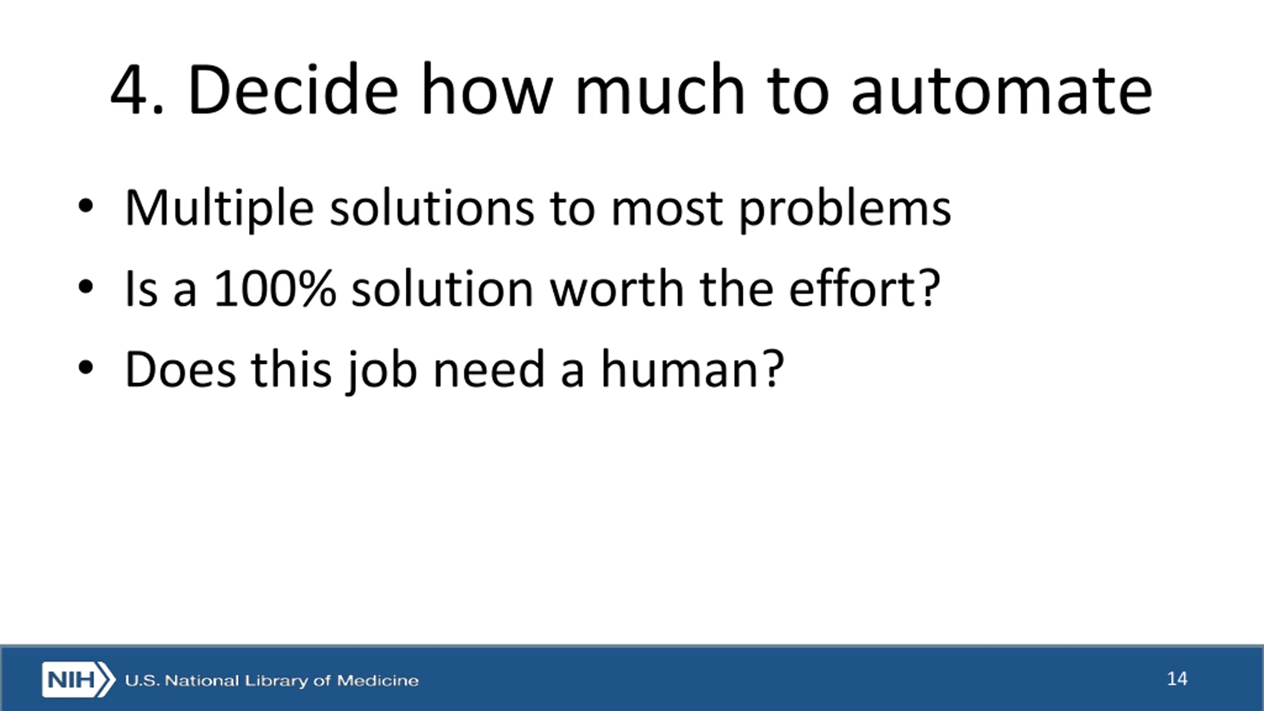 4. Decide how much to automate Multiple solutions to most problems Is a 100% solution worth the effort? Does this job need a human? 14