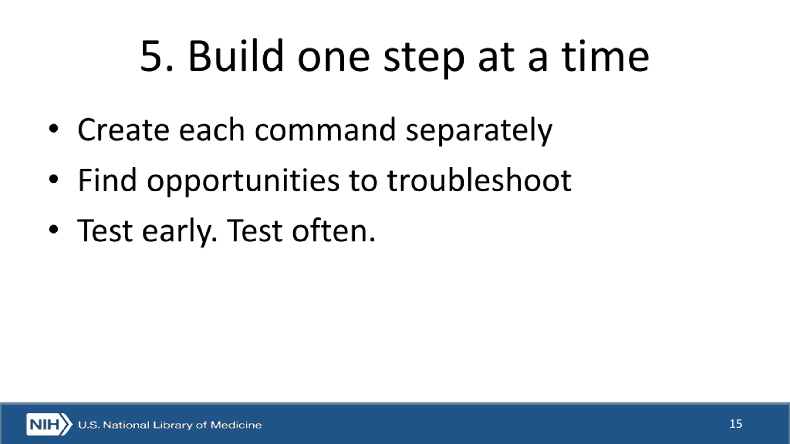 5. Build one step at a time Create each command separately Find opportunities to troubleshoot Test early. Test often. 15