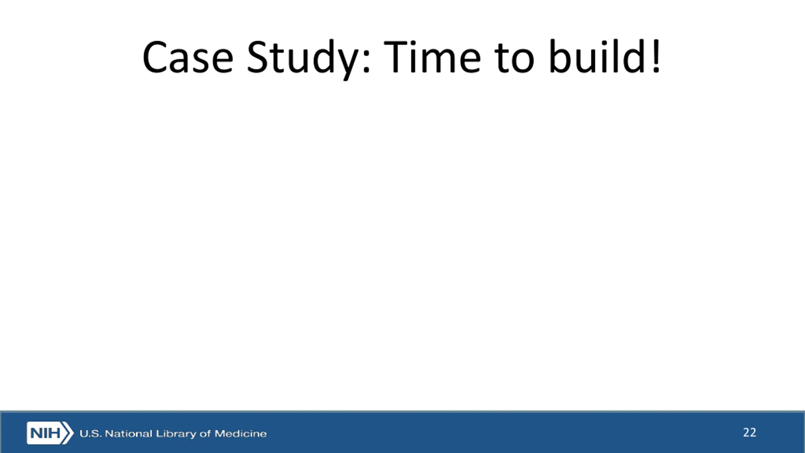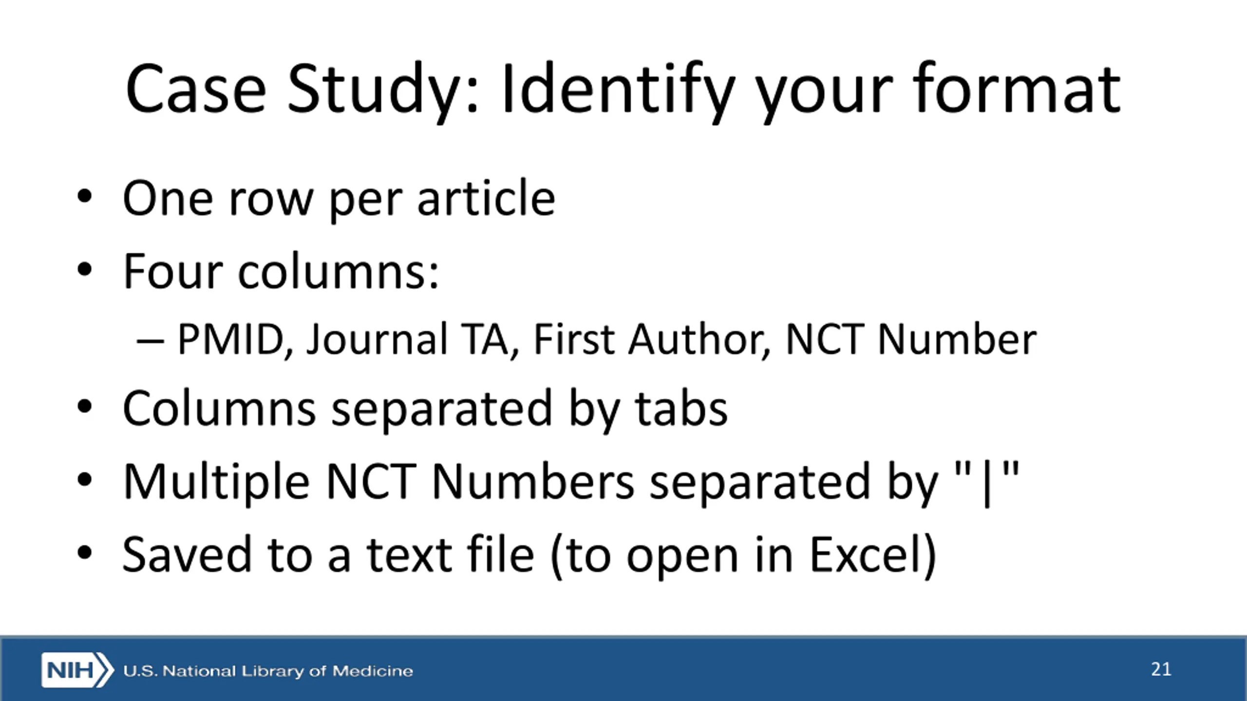 Case Study: Identify your format One row per article Four columns: PMID, Journal TA, First Author, NCT Number Columns separated by tabs Multiple NCT Numbers separated by "|" Saved to a text file (to open in Excel) 21