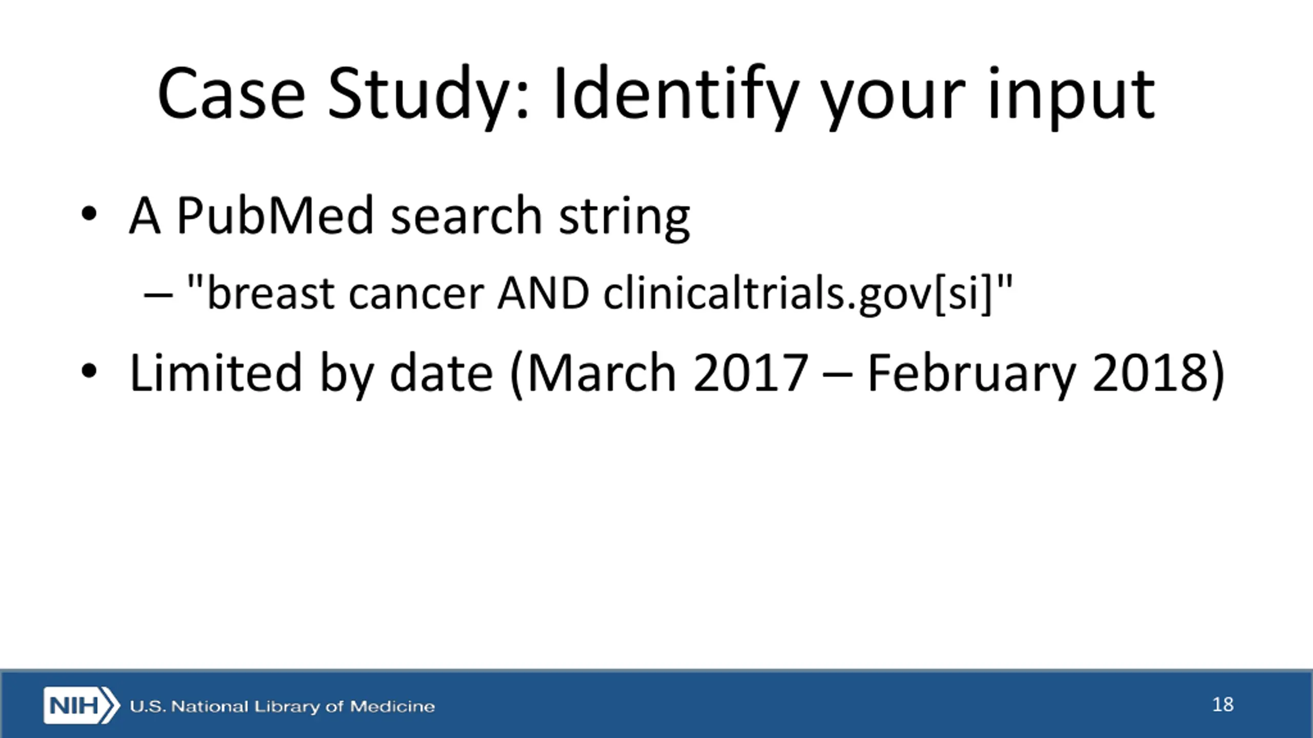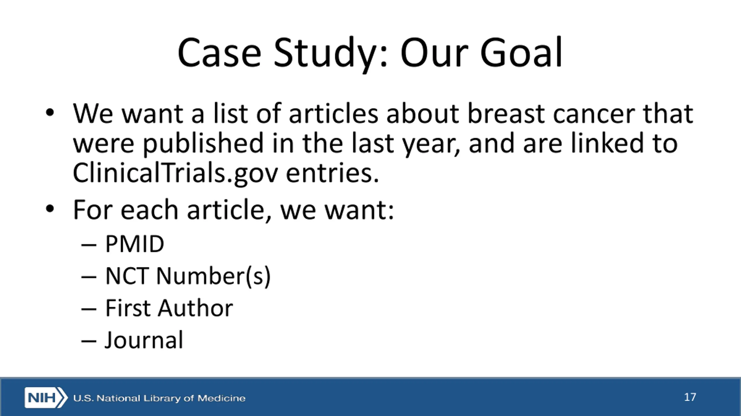 Case Study: Our Goal We want a list of articles about breast cancer that were published in the last year, and are linked to ClinicalTrials.gov entries. For each article, we want: PMID NCT Number(s) First Author Journal 17