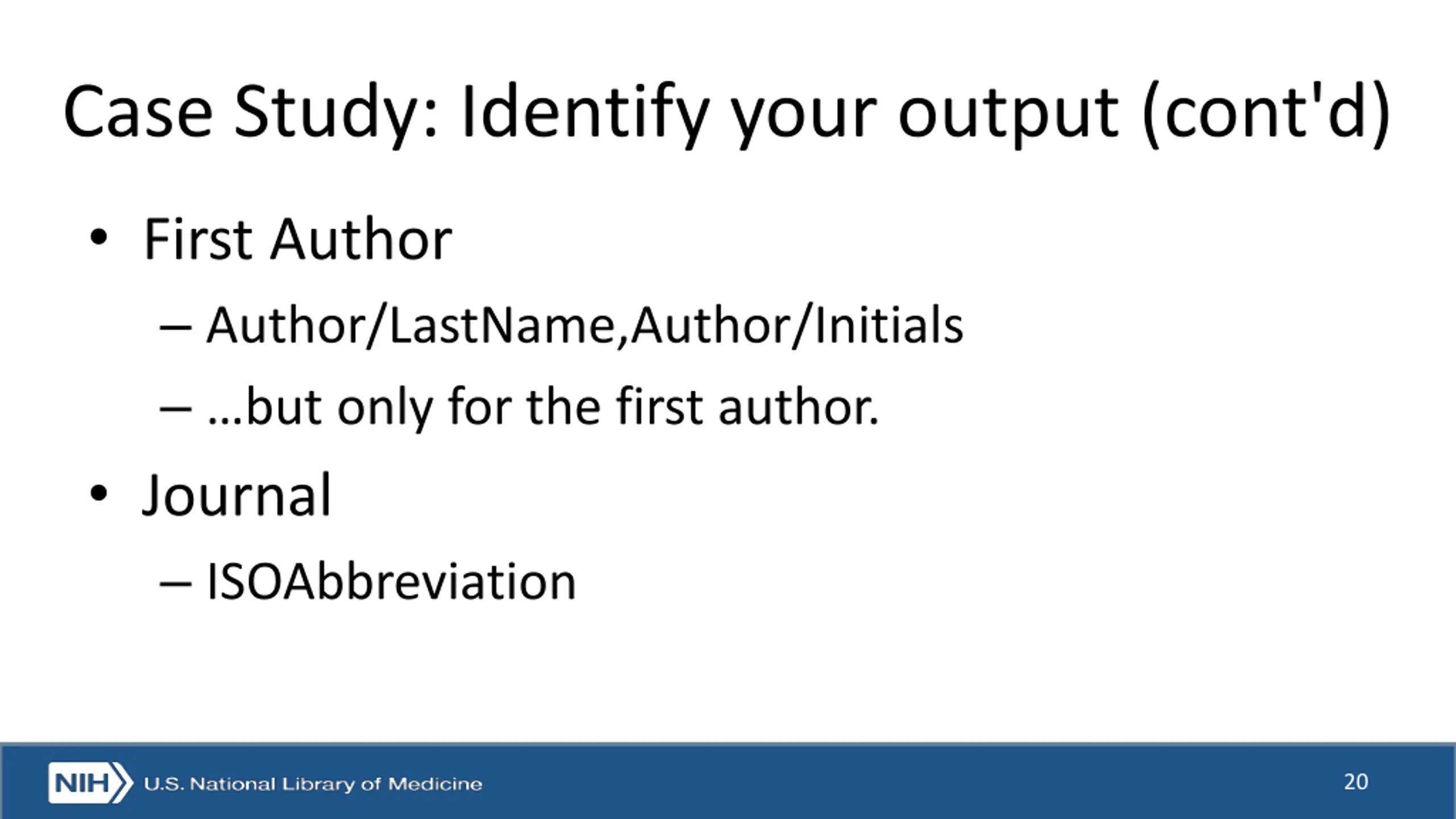 Case Study: Identify your output (cont'd) First Author Author/LastName,Author/Initials but only for the first author. Journal ISOAbbreviation 20