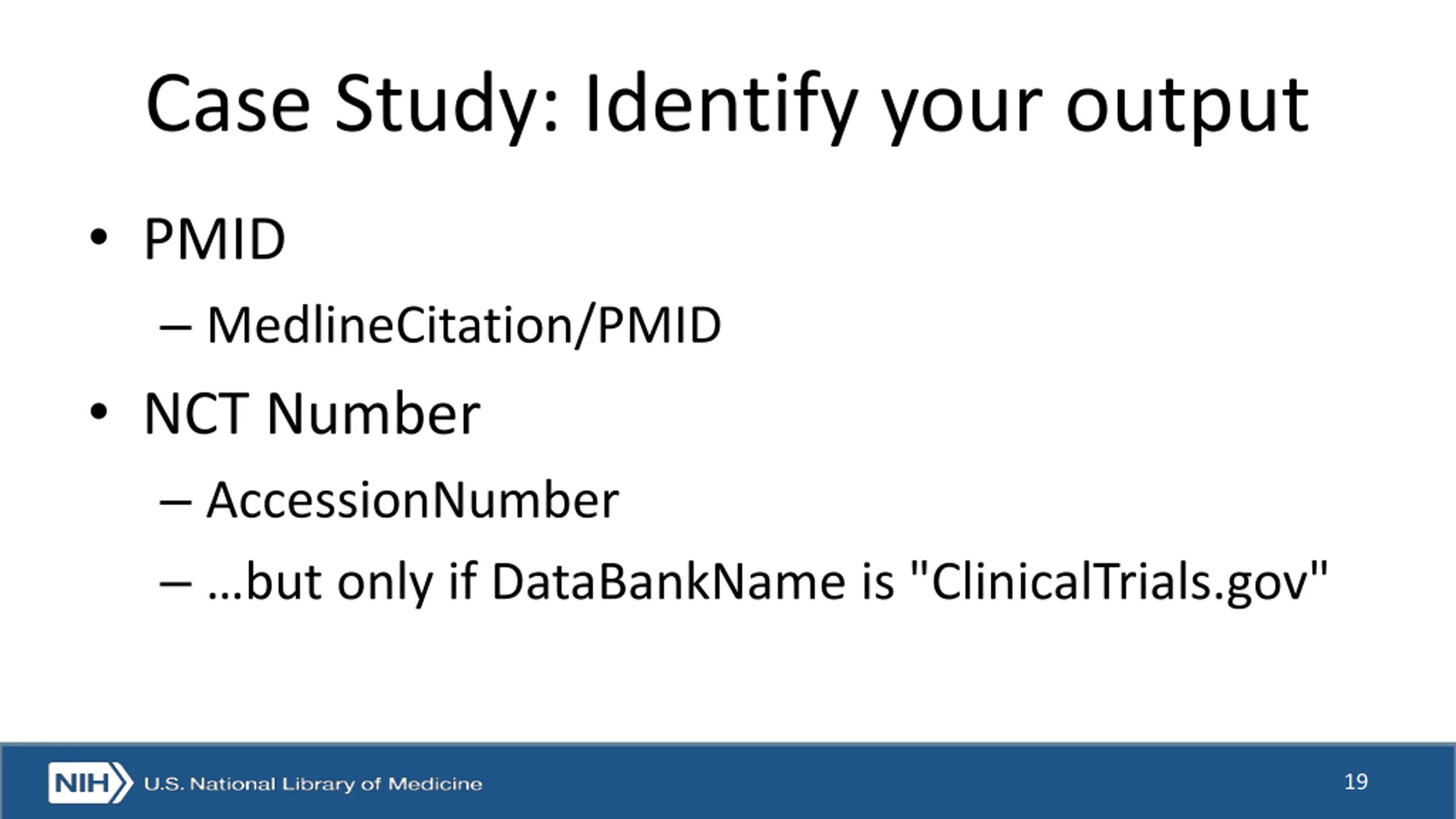 Case Study: Identify your output PMID MedlineCitation/PMID NCT Number AccessionNumber but only if DataBankName is "ClinicalTrials.gov" 19