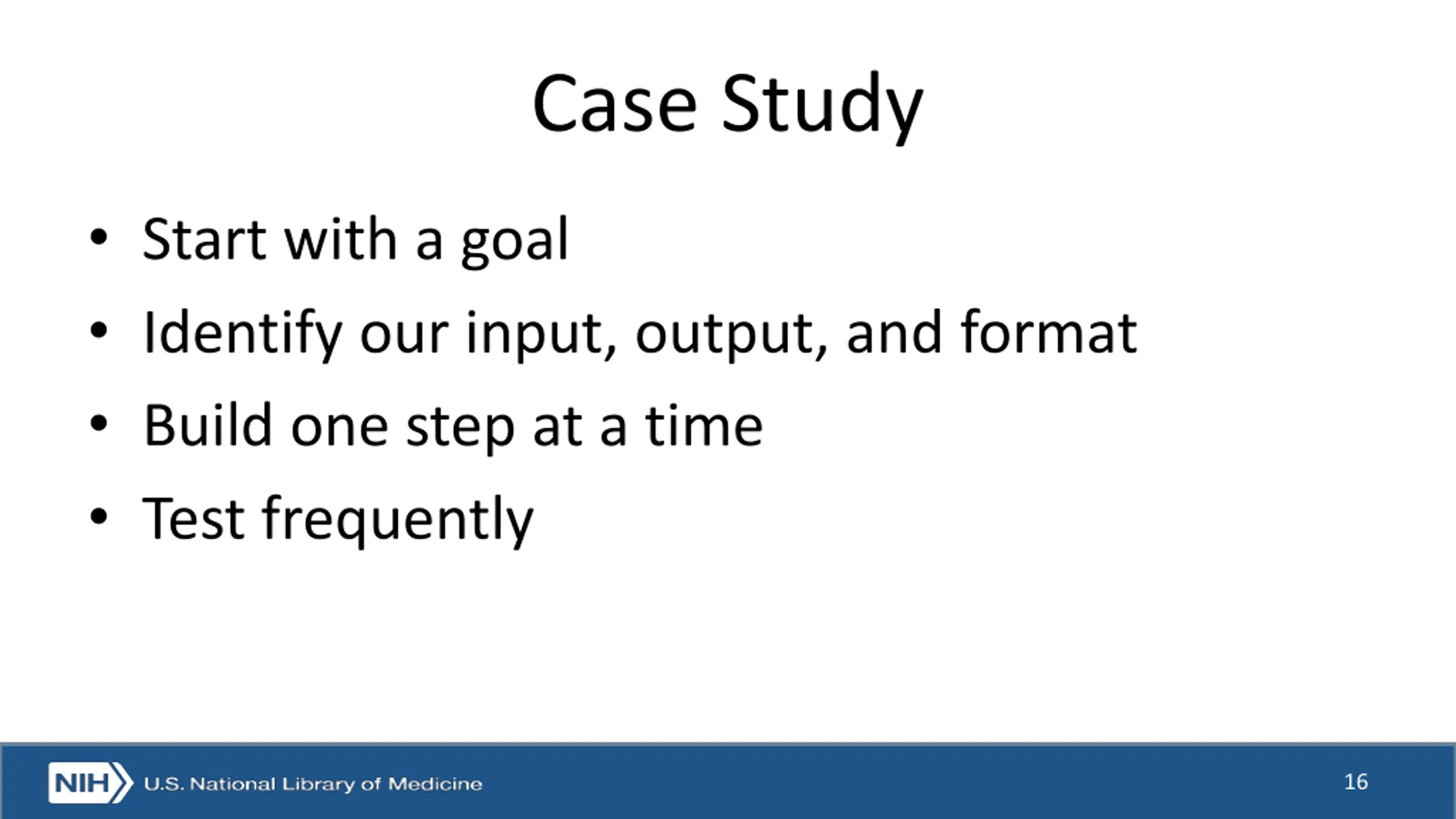 Case Study Start with a goal Identify our input, output, and format Build one step at a time Test frequently 16