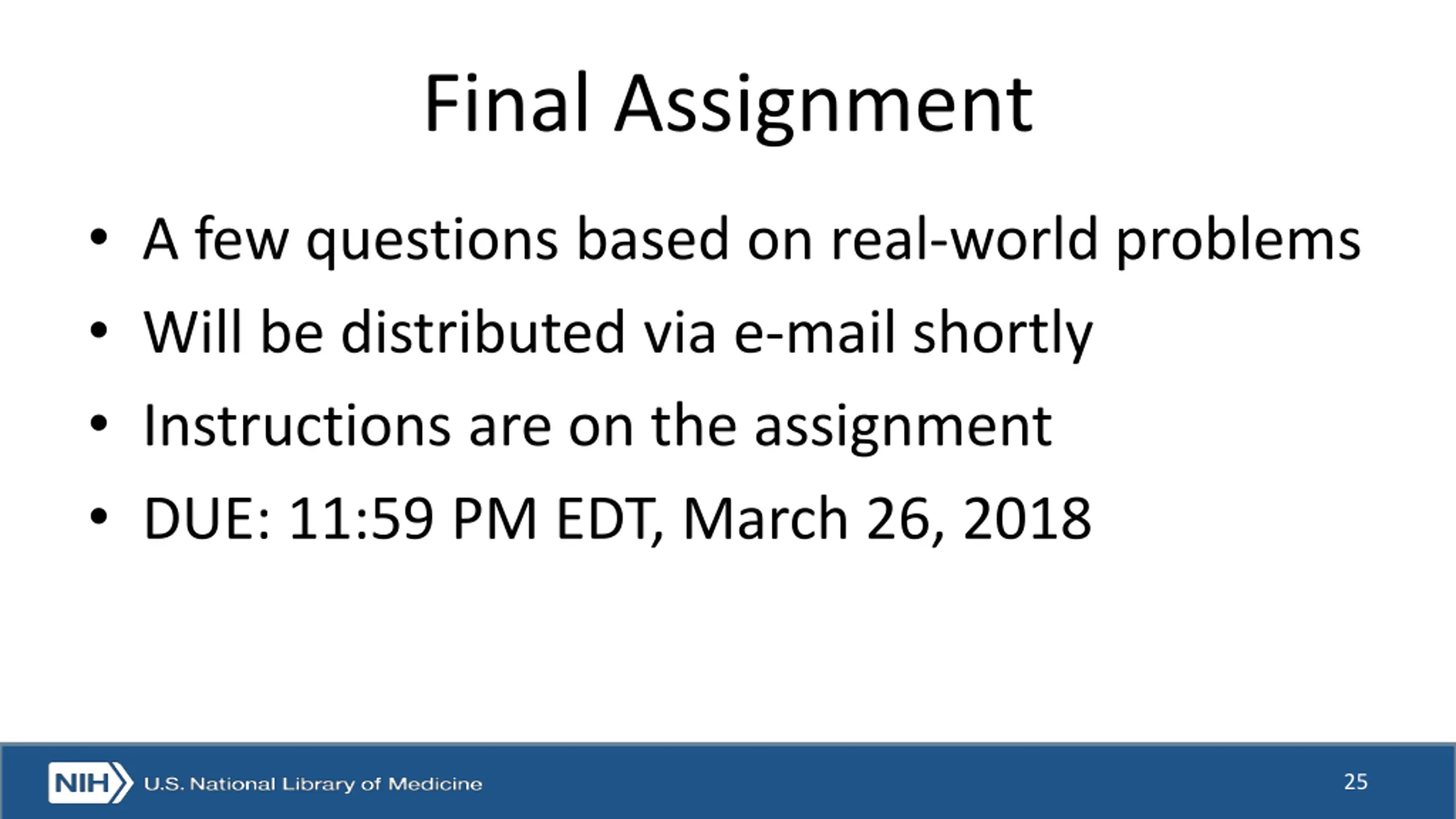 Final Assignment A few questions based on real-world problems Will be distributed via e-mail shortly Instructions are on the assignment DUE: 11:59 PM EDT, March 26, 2018 25