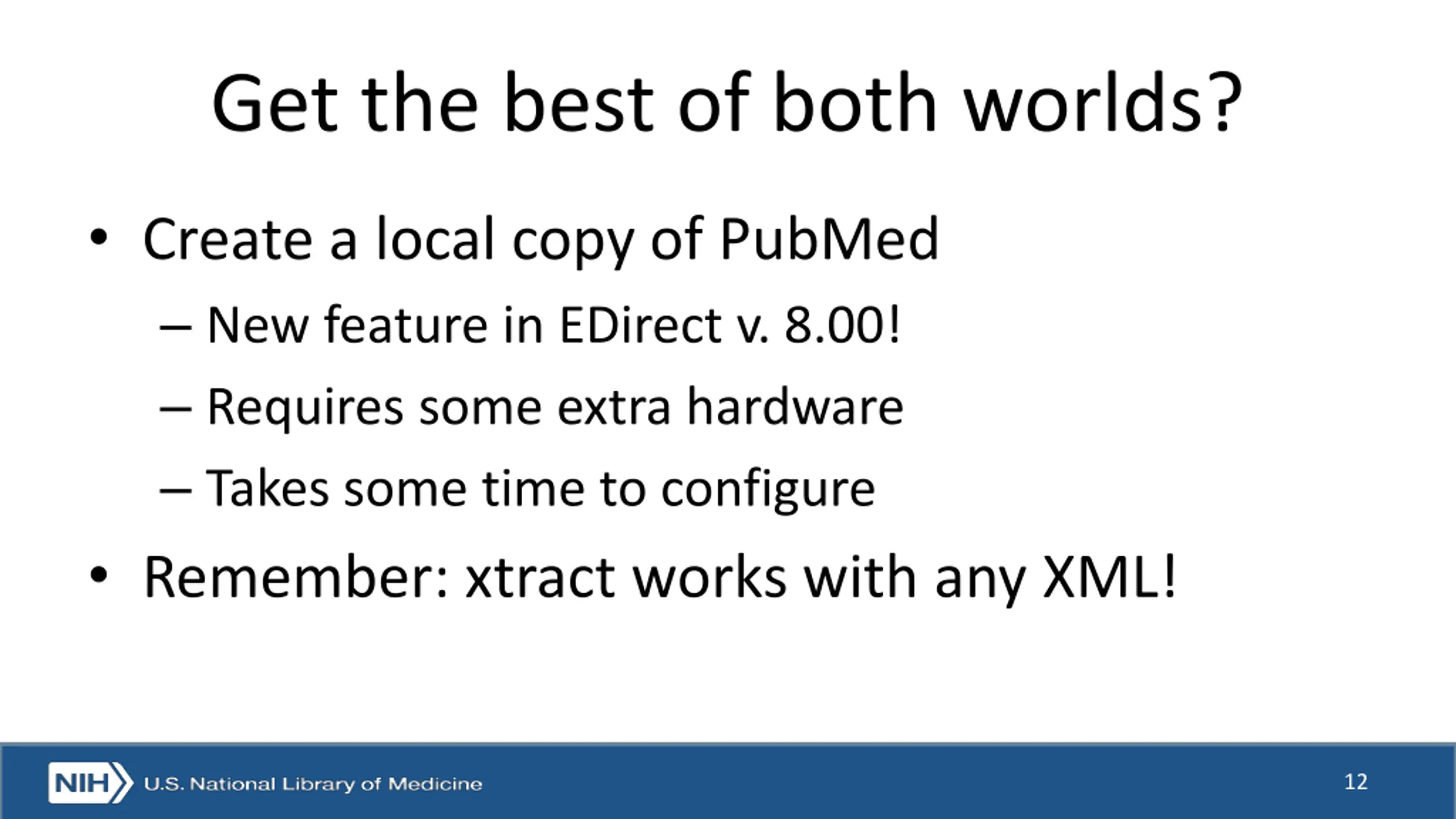 Get the best of both worlds? Create a local copy of PubMed New feature in EDirect v. 8.00! Requires some extra hardware Takes some time to configure Remember: xtract works with any XML! 12
