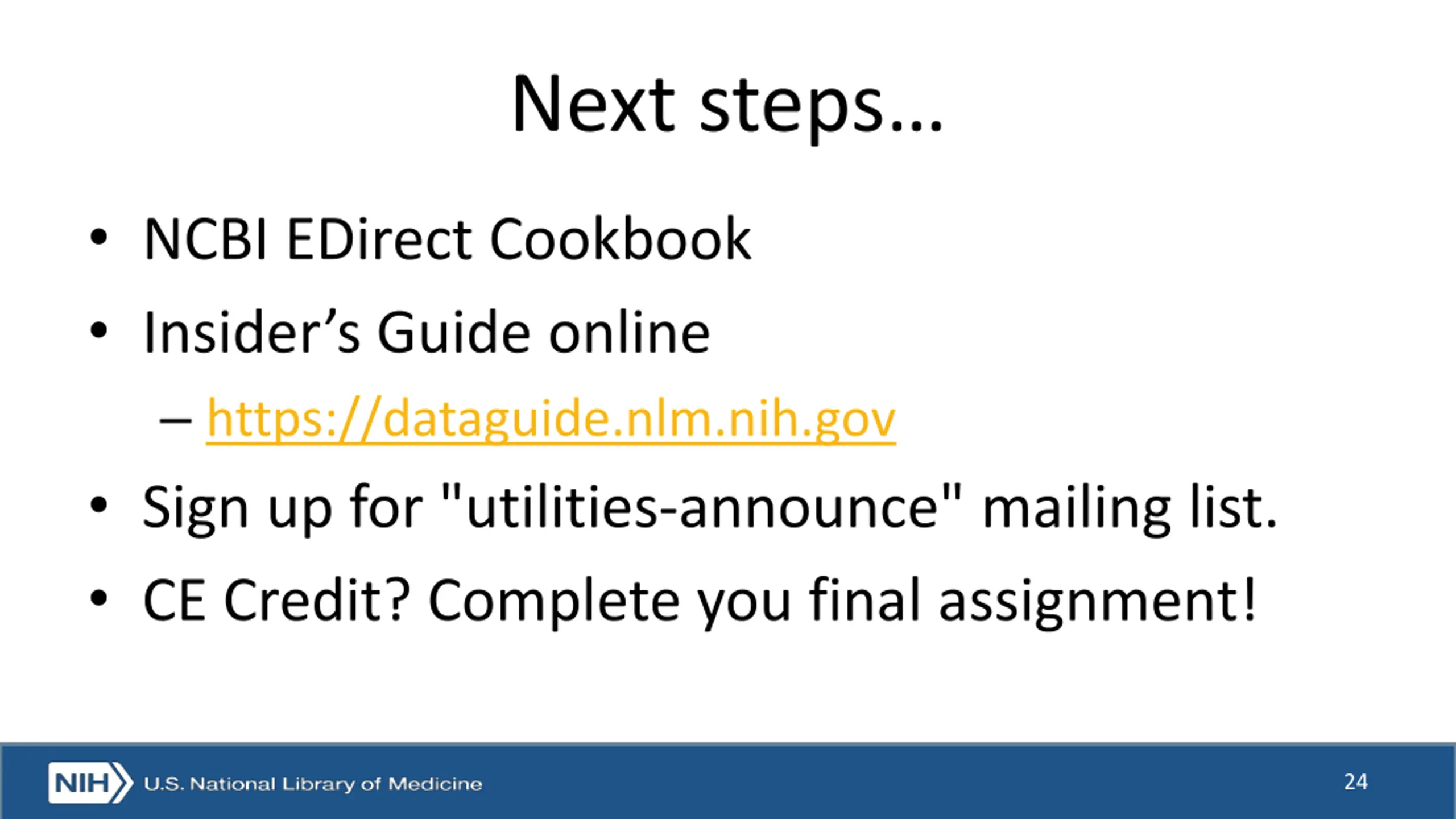 Next steps NCBI EDirect Cookbook Insider s Guide online https://dataguide.nlm.nih.gov Sign up for "utilities-announce" mailing list. CE Credit? Complete you final assignment! 24